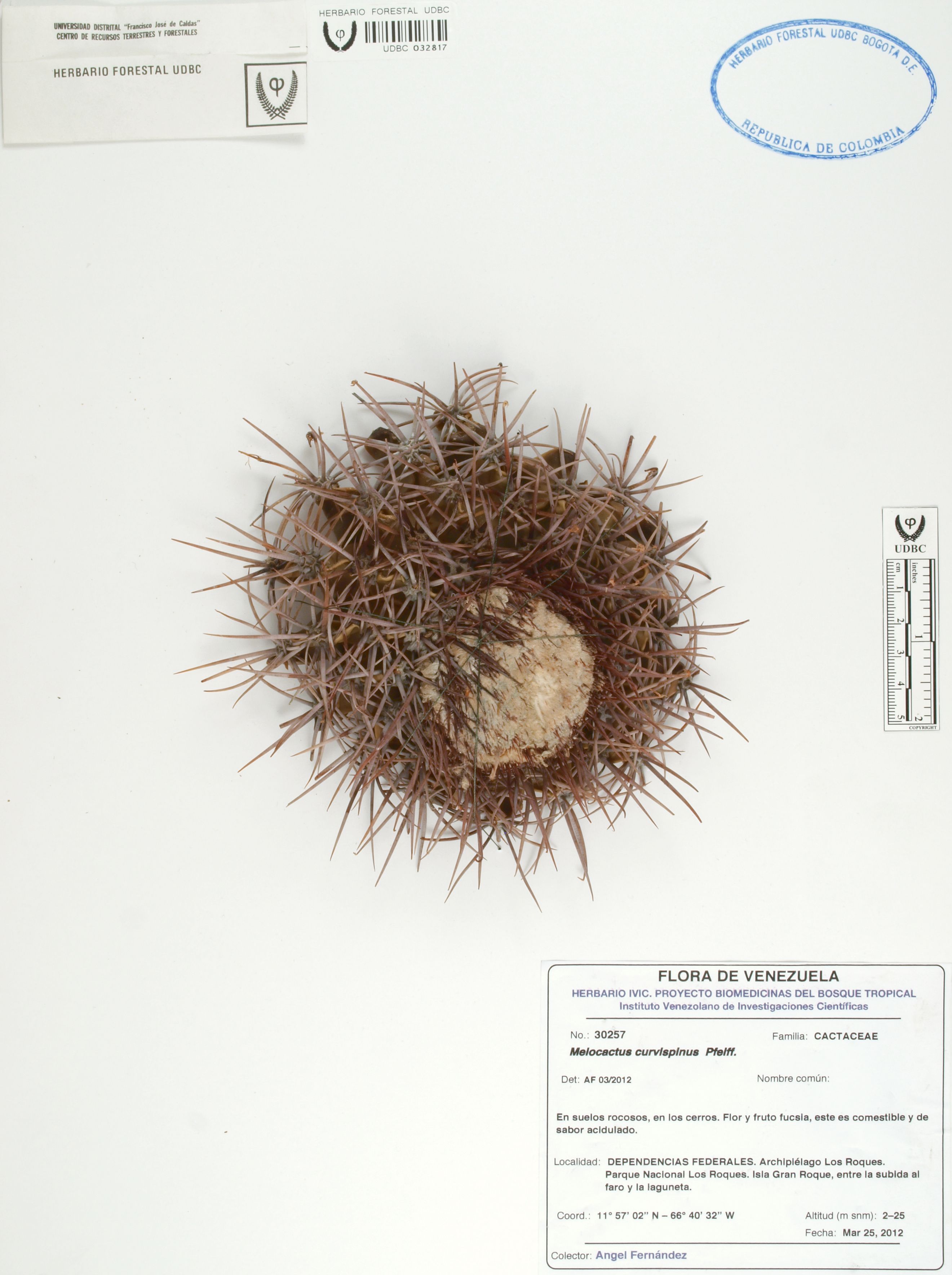 Fotografía del ejemplar Fernández, A. 30257, determinado como Melocactus curvispinus en el año 2012