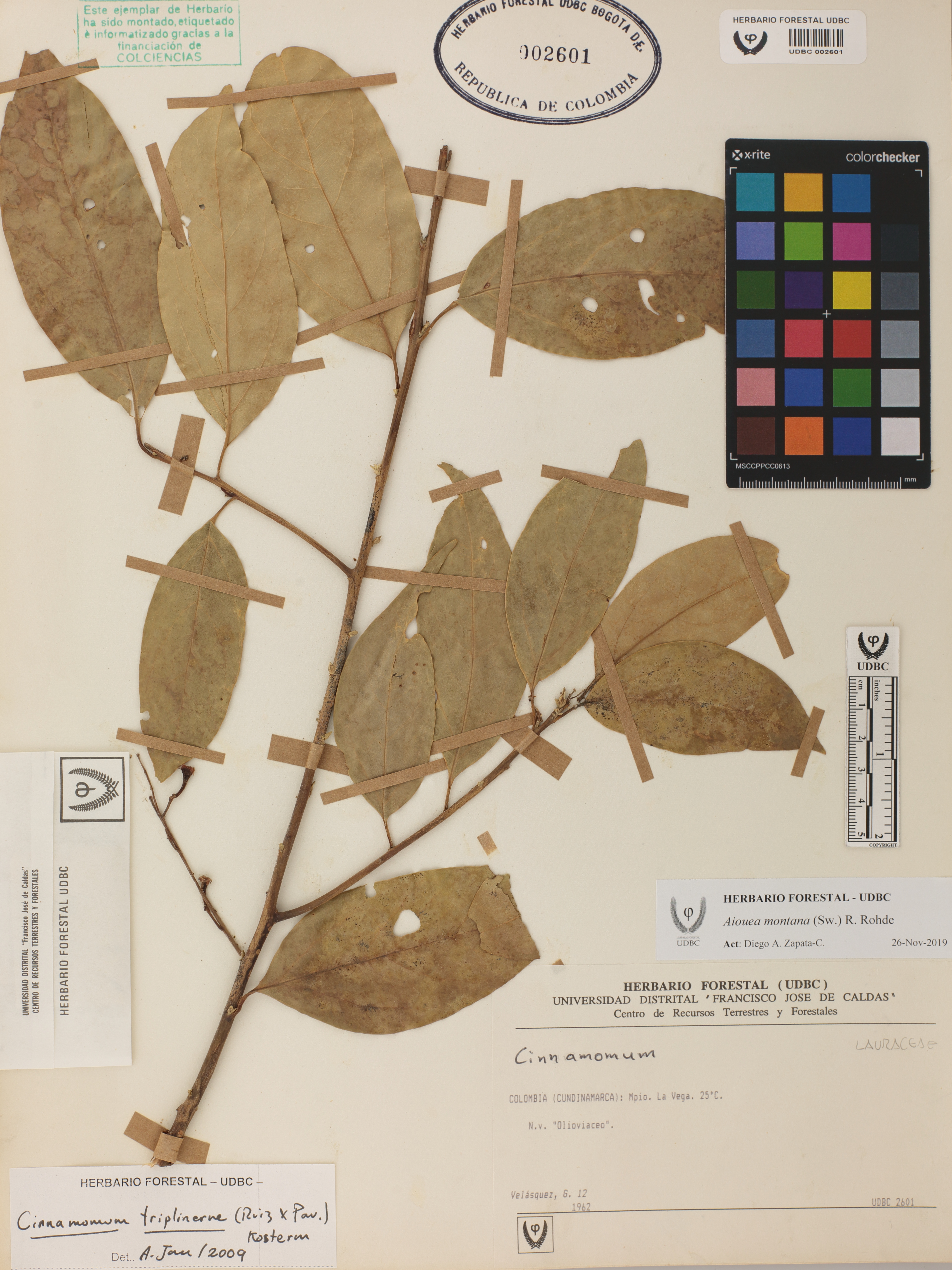 Fotografía del ejemplar Velásquez, G. 12, determinado como Aiouea montana en el año 2019