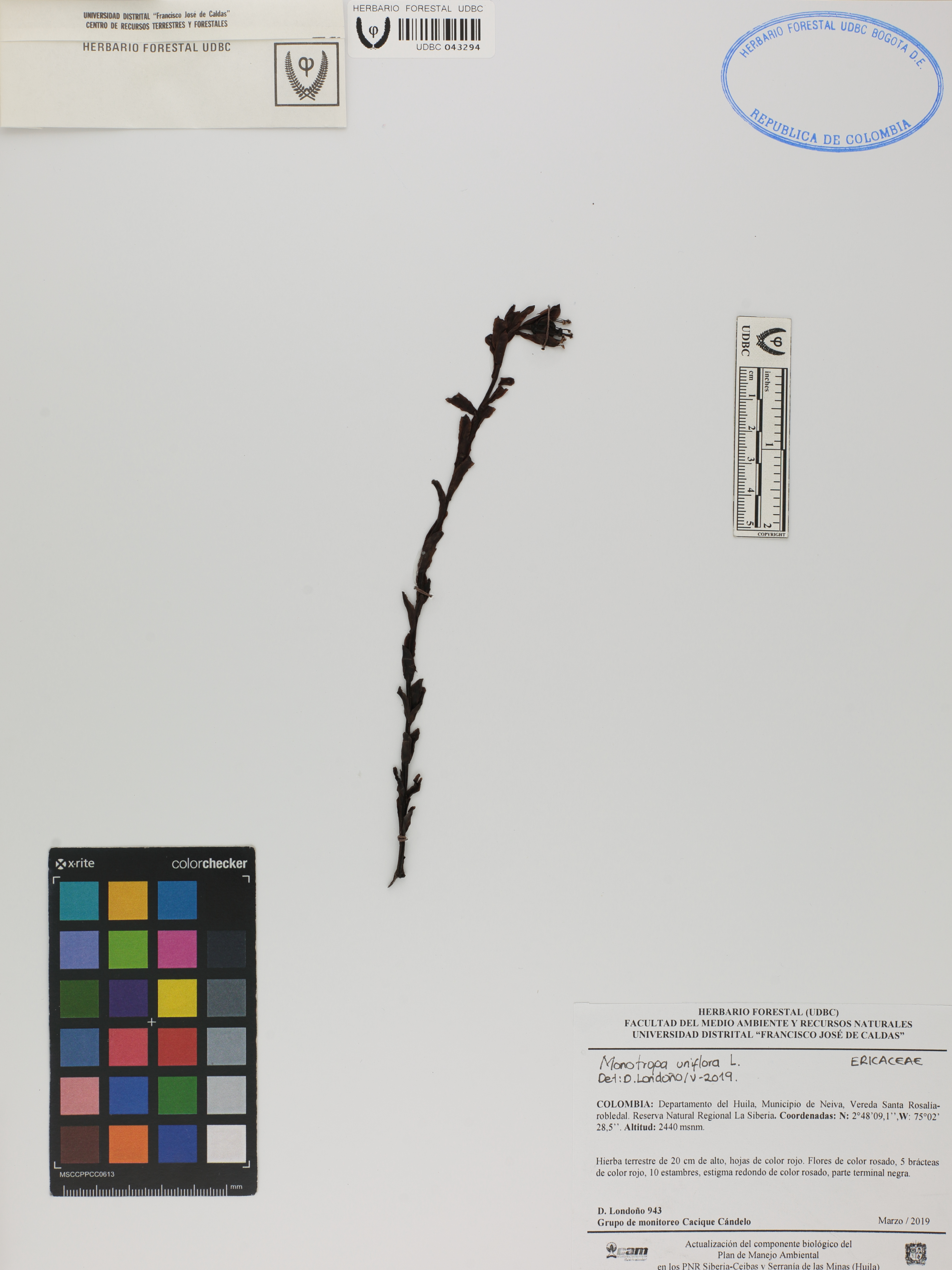 Fotografía del ejemplar Londoño, D. 943, determinado como Monotropa uniflora en el año 2019