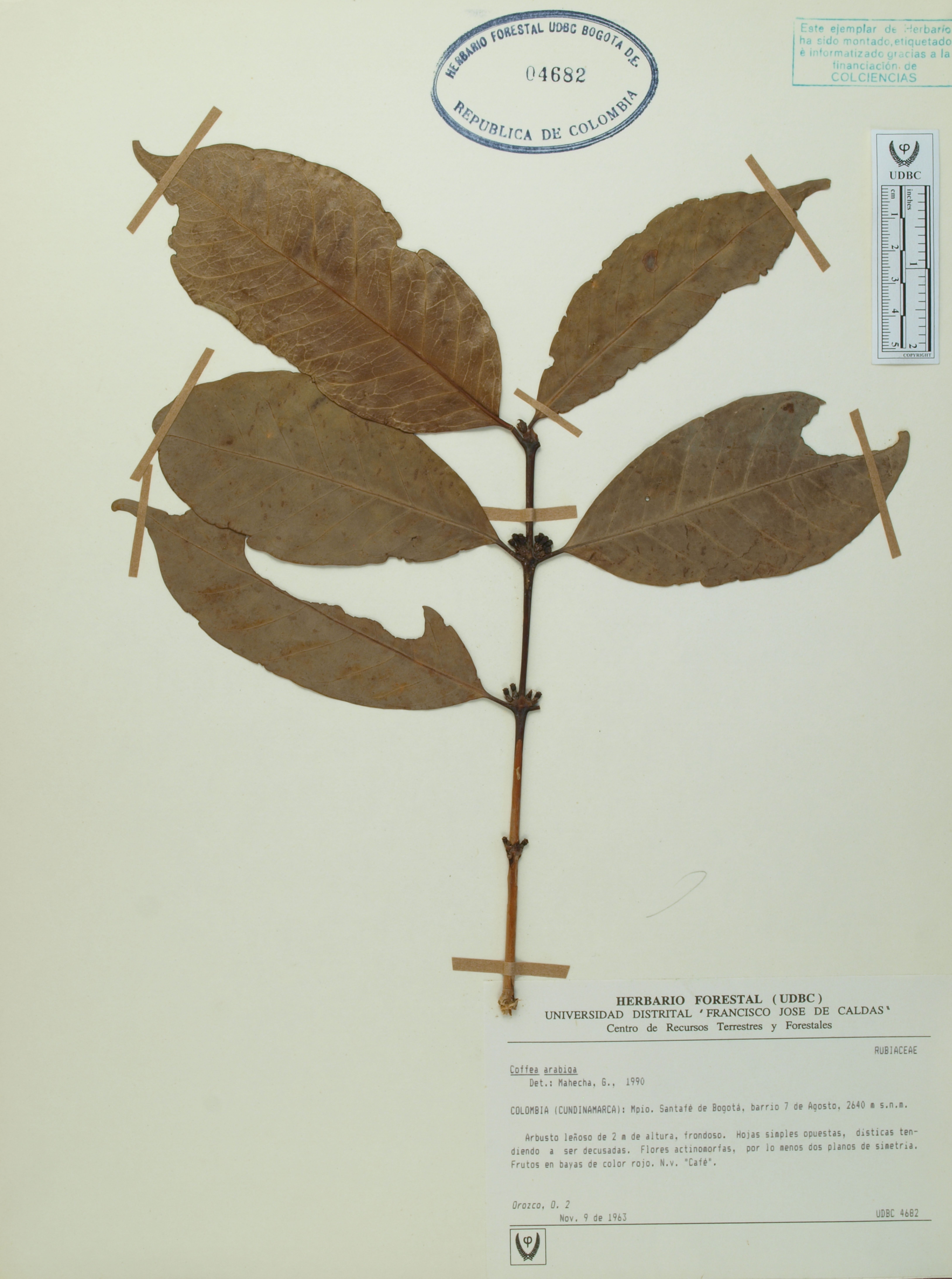 Fotografía del ejemplar Orozco, O. 2, determinado como Coffea arabica en el año 1990