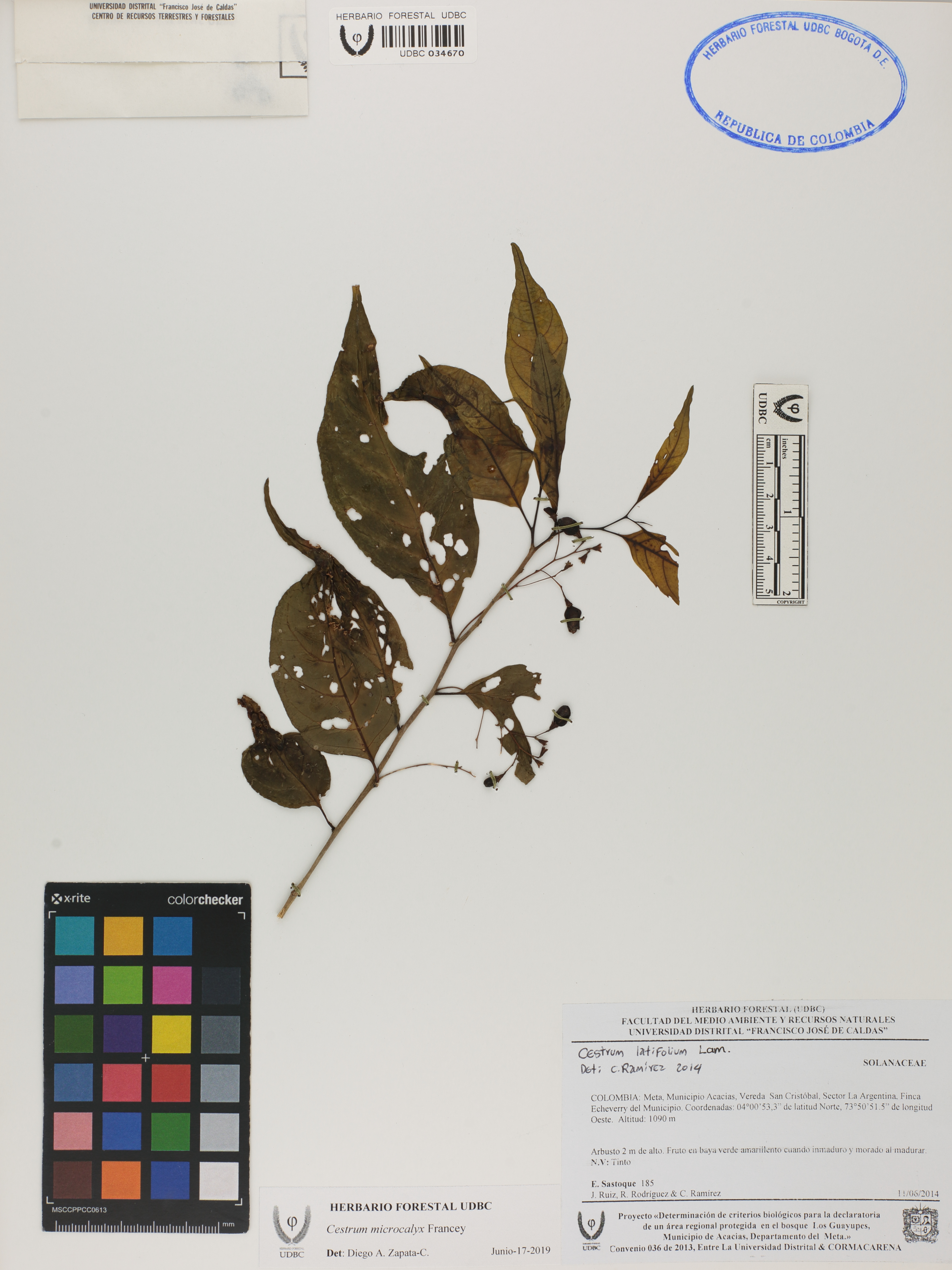Fotografía del ejemplar Sastoque, E. 185, determinado como Cestrum microcalyx en el año 2019