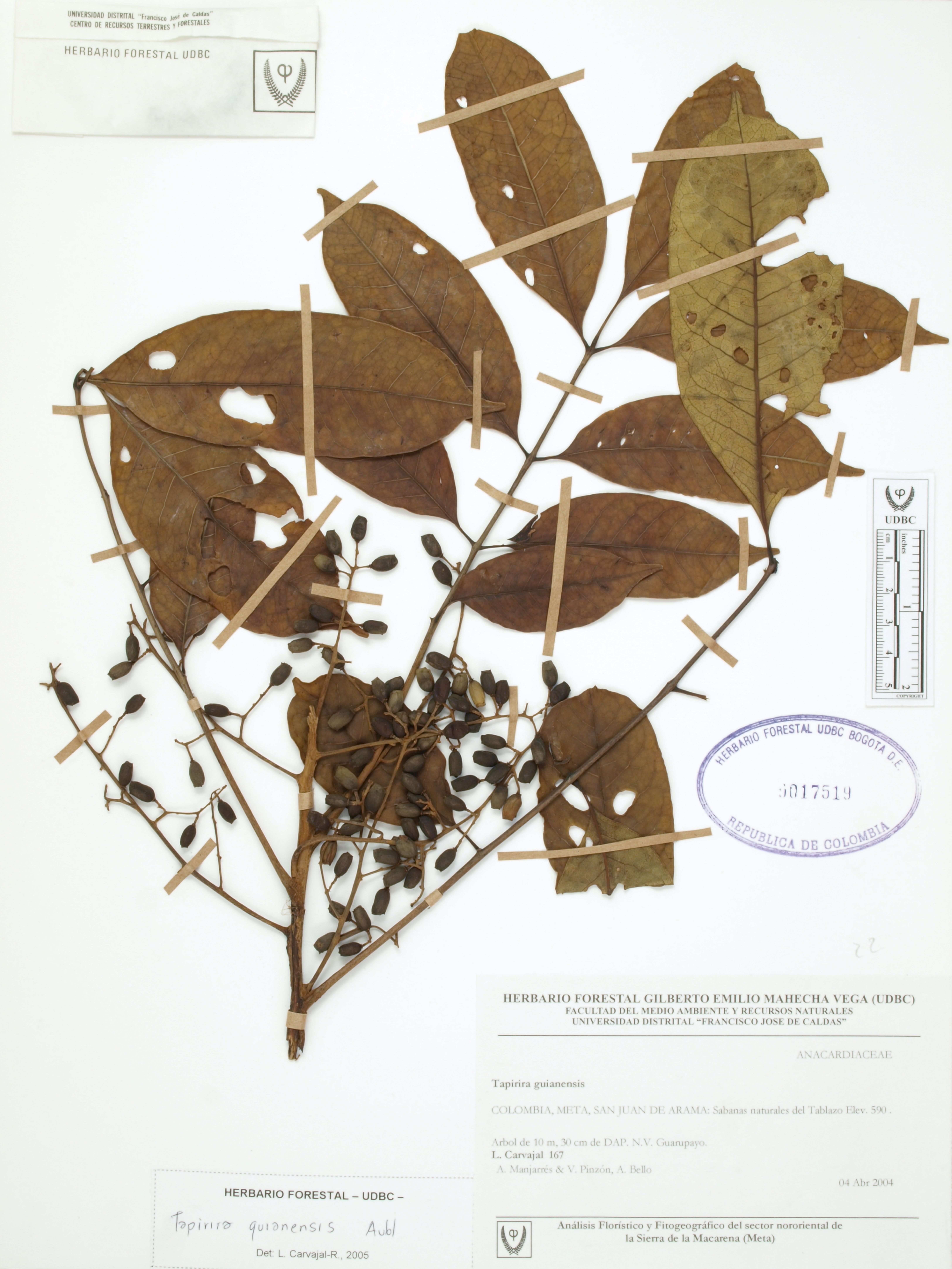 Fotografía del ejemplar Carvajal, L. 167, determinado como Tapirira guianensis en el año 2005