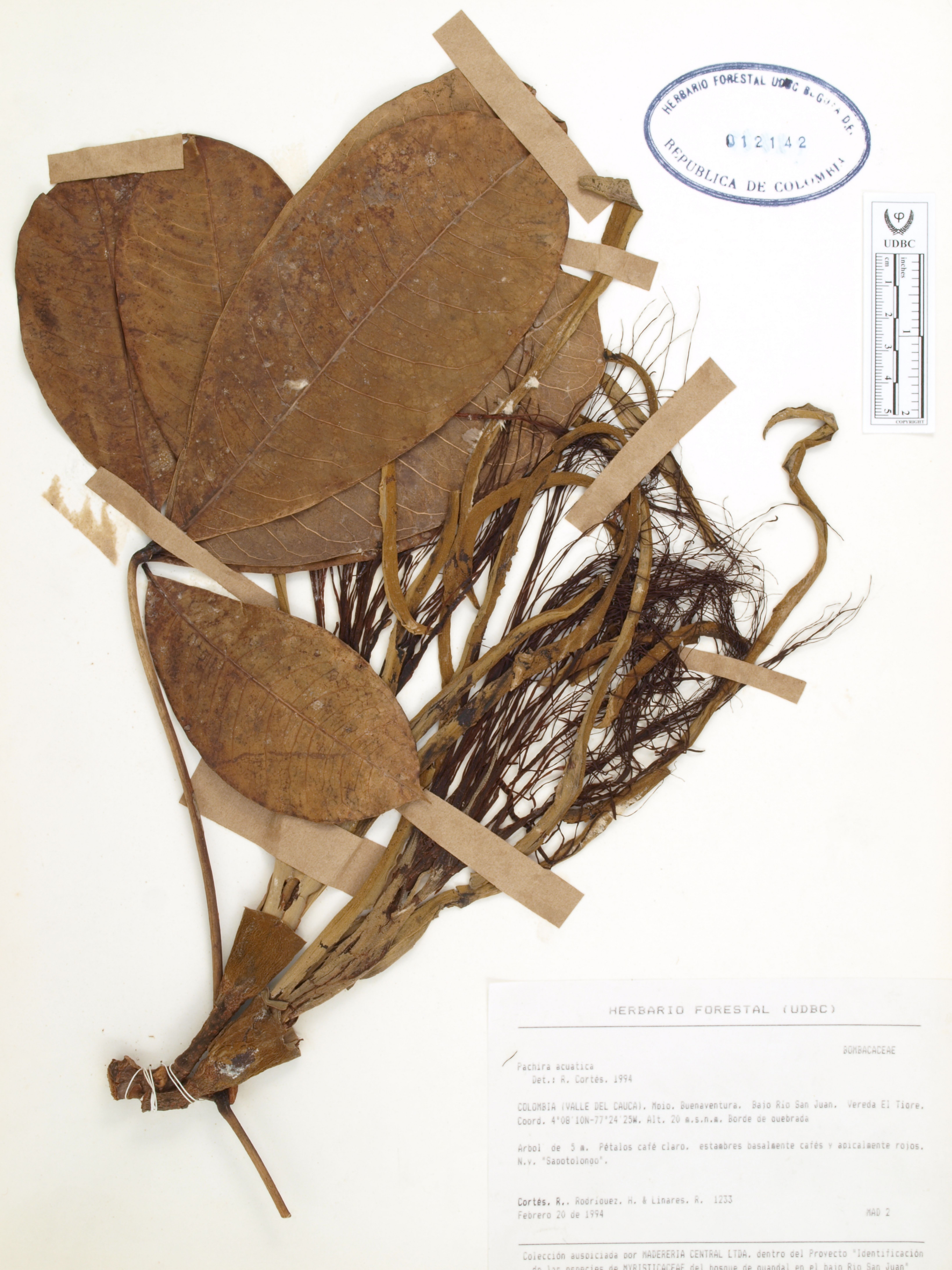 Fotografía del ejemplar Cortés-B., R. 1233, determinado como Pachira aquatica en el año 1994