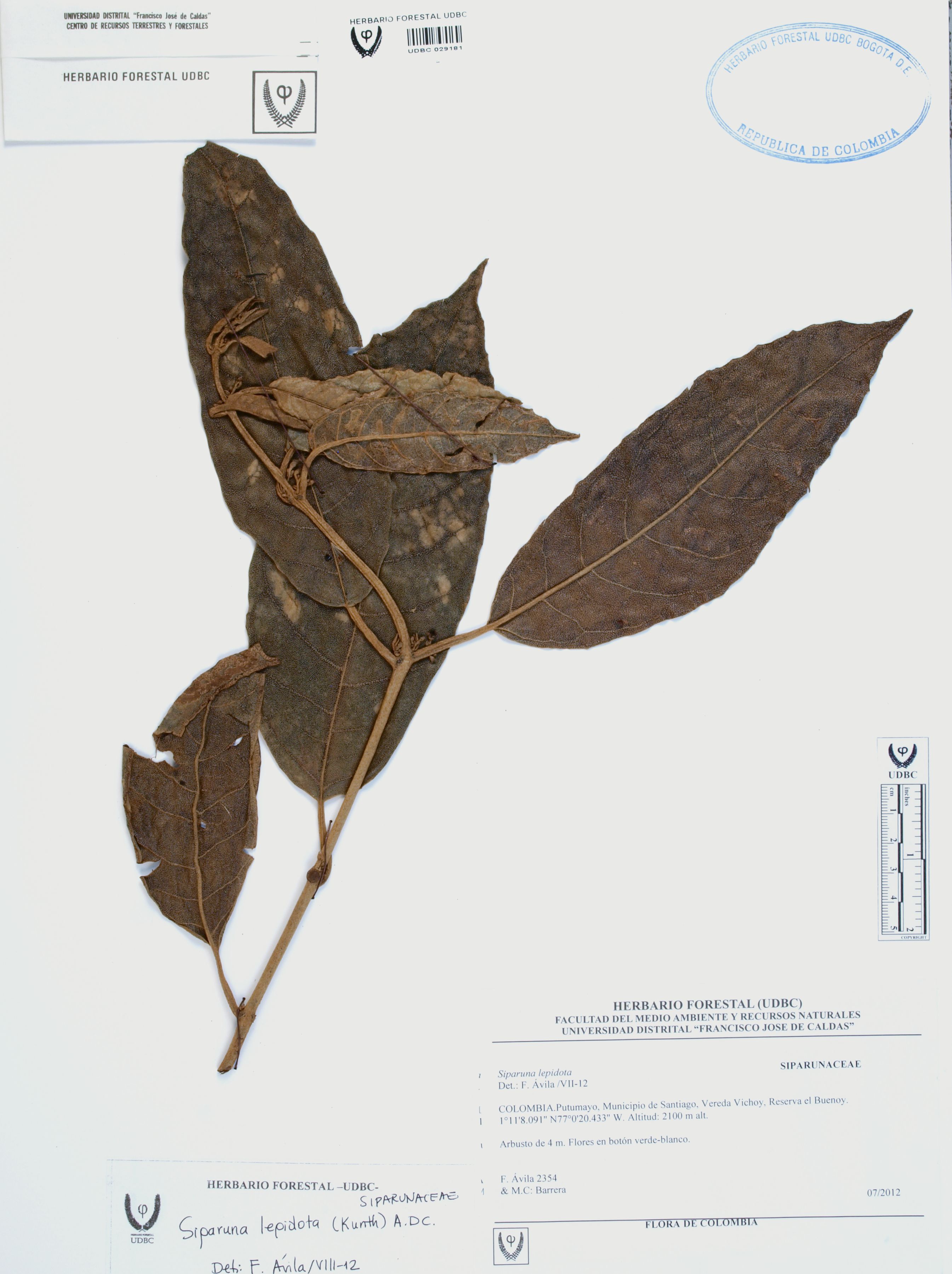 Fotografía del ejemplar Ávila, F. 2354, determinado como Siparuna lepidota en el año 2012