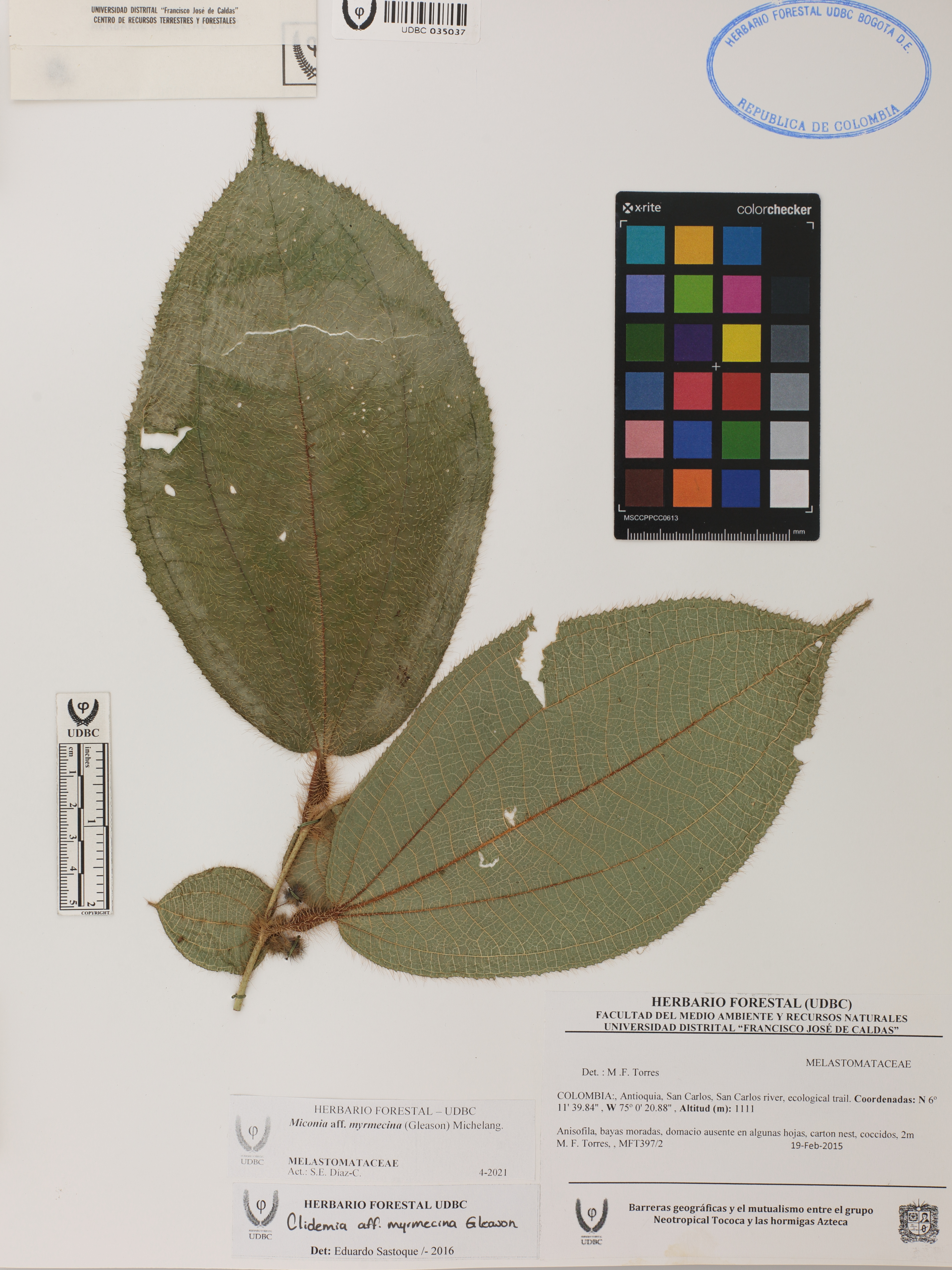 Fotografía del ejemplar Torres, M. 397/2, determinado como Miconia myrmecina en el año 2016
