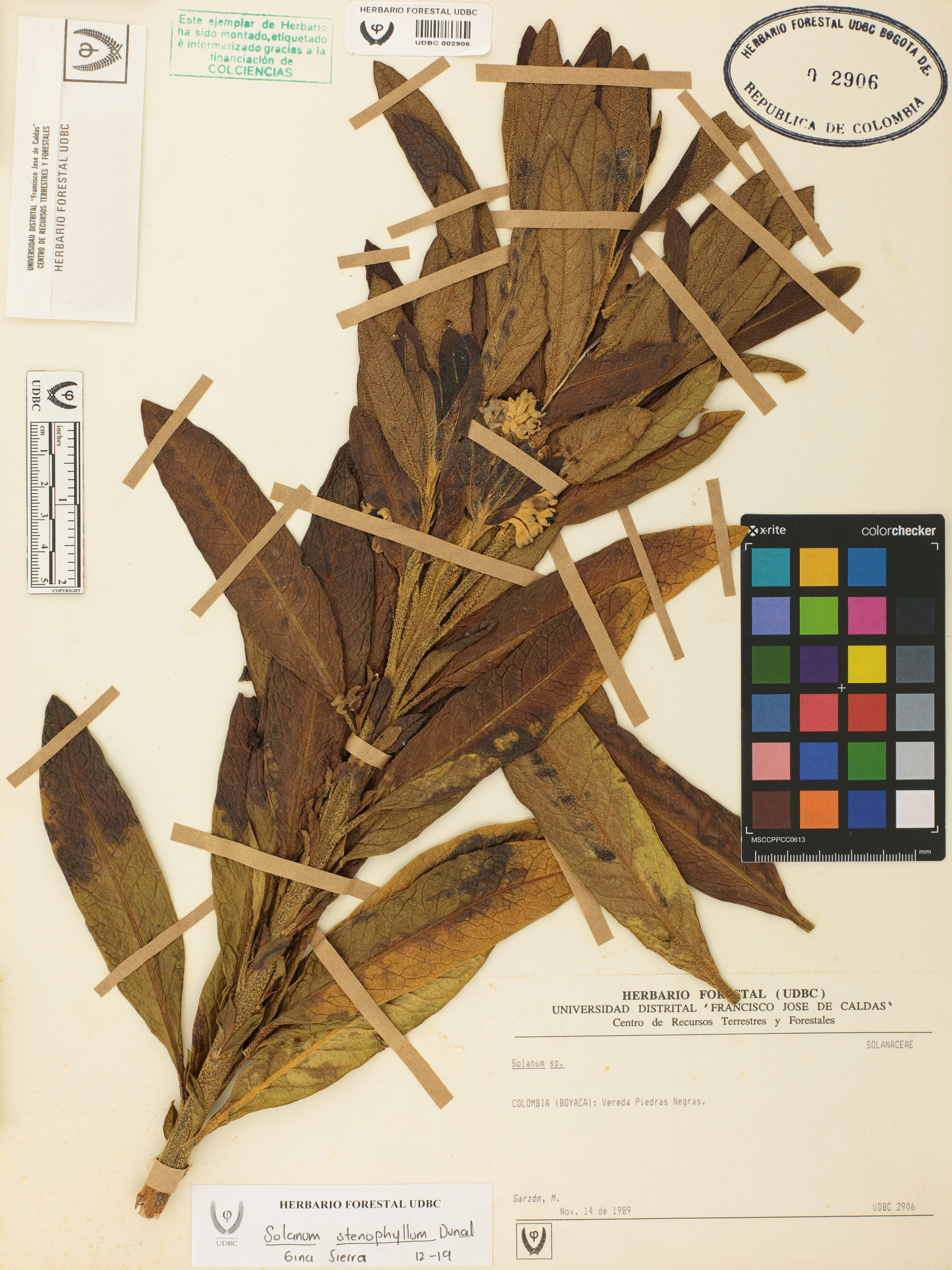 Fotografía del ejemplar Garzón, M., determinado como Solanum stenophyllum en el año 2019