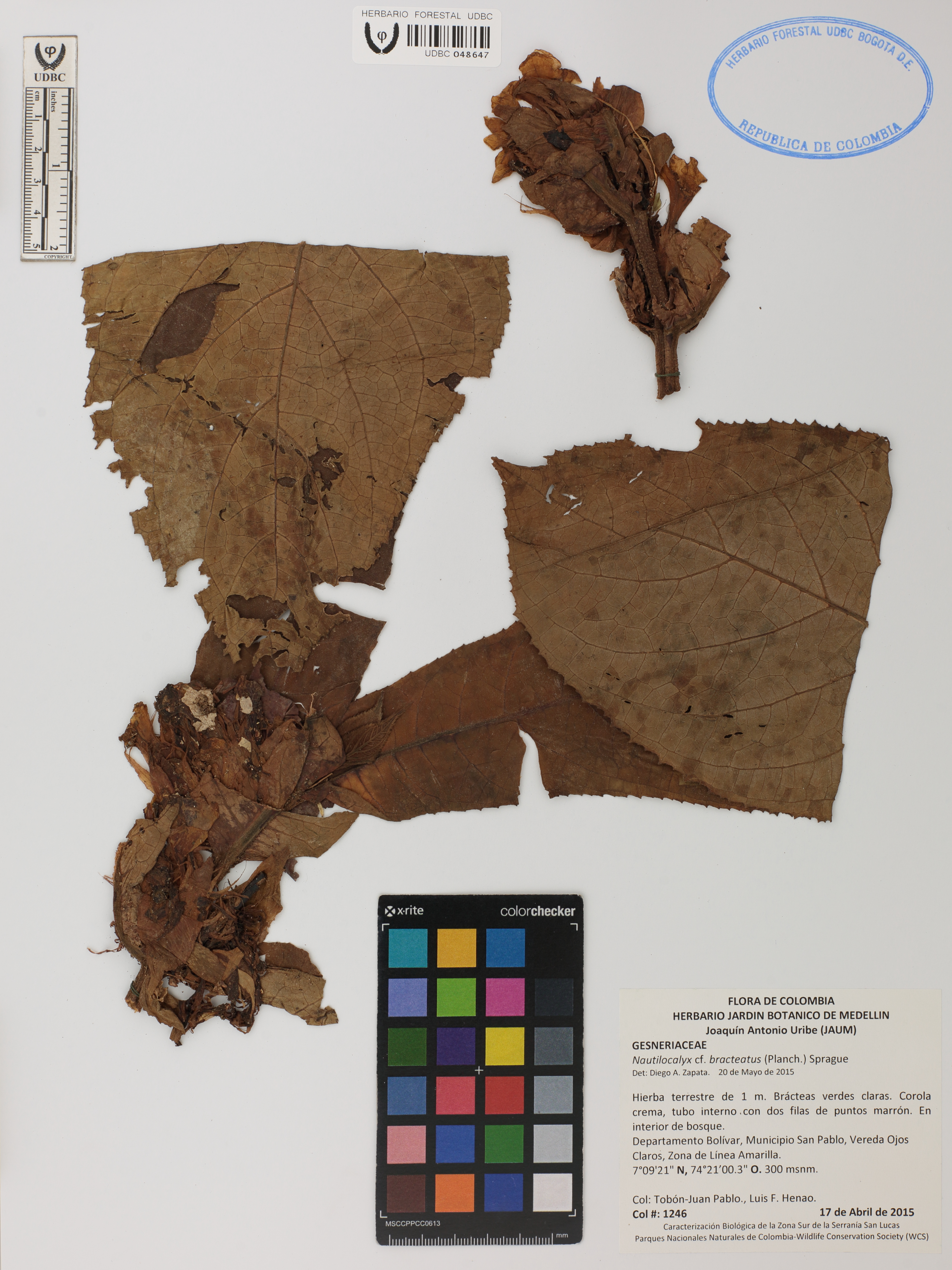 Fotografía del ejemplar Tobón-A., J. 1246, determinado como Nautilocalyx bracteatus en el año 2015