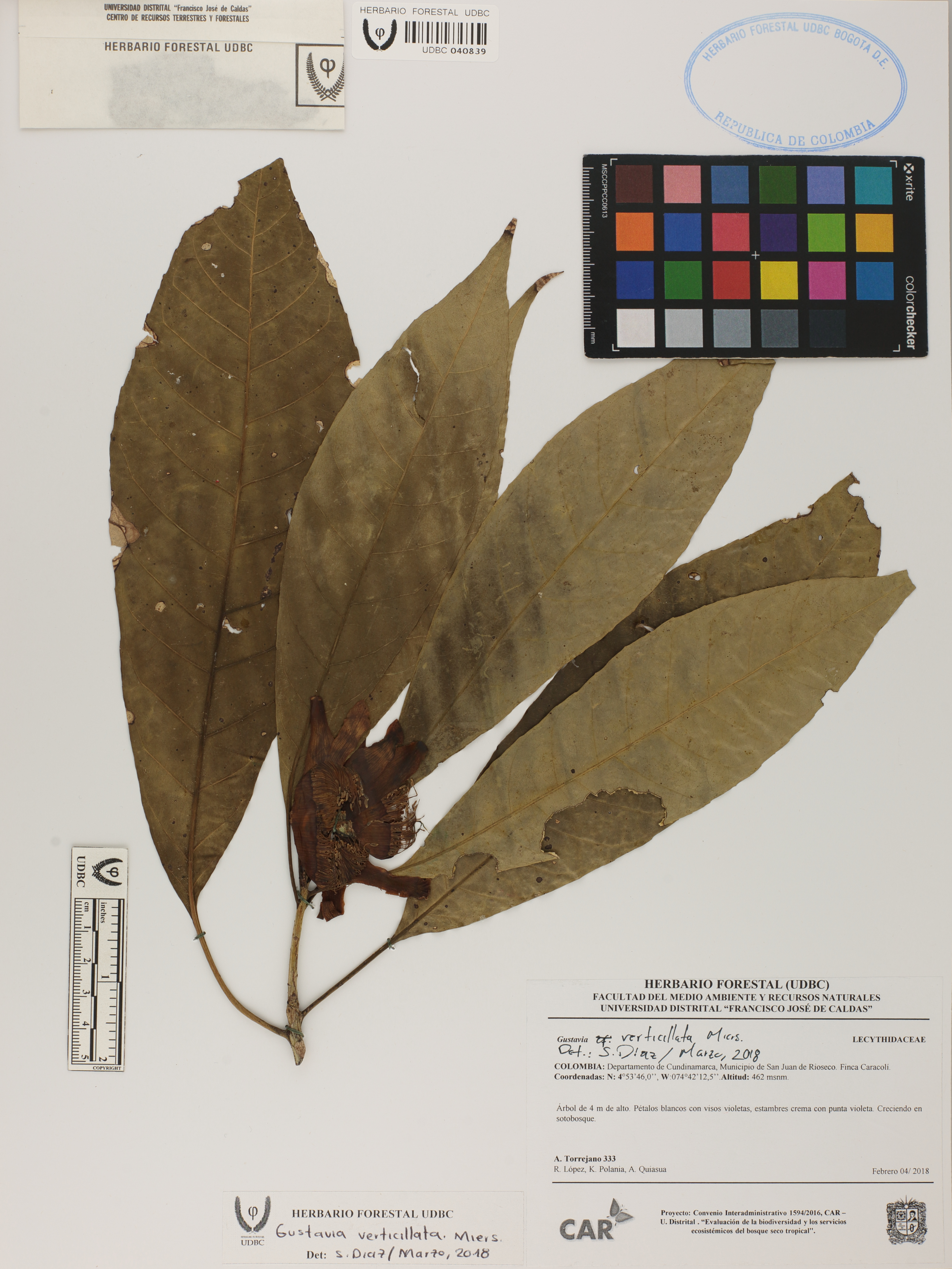 Fotografía del ejemplar Torrejano, A. 333, determinado como Gustavia verticillata en el año 2018