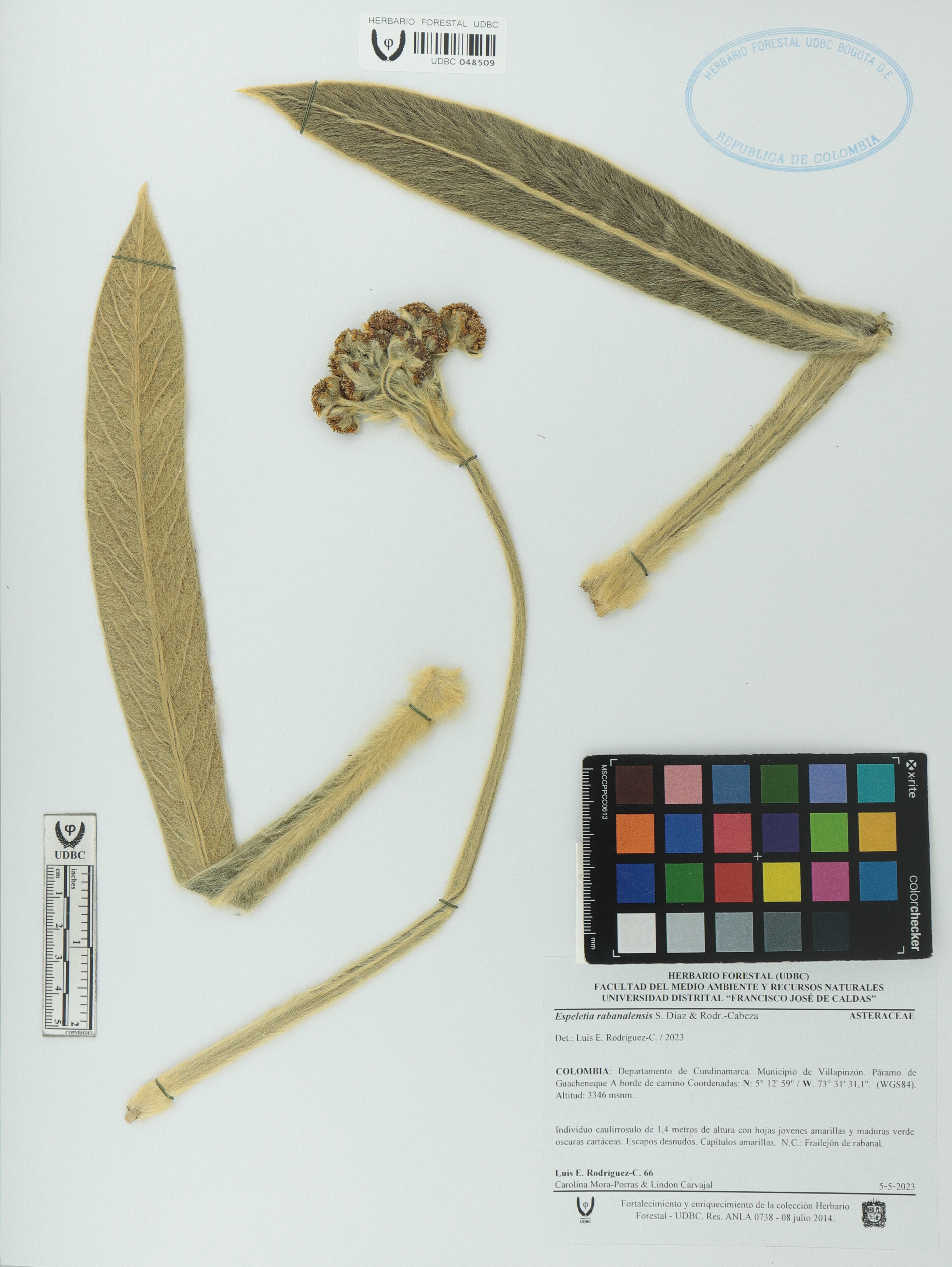 Fotografía del ejemplar Rodríguez-C., Luis 66, determinado como Espeletiopsis rabanalensis en el año 2023