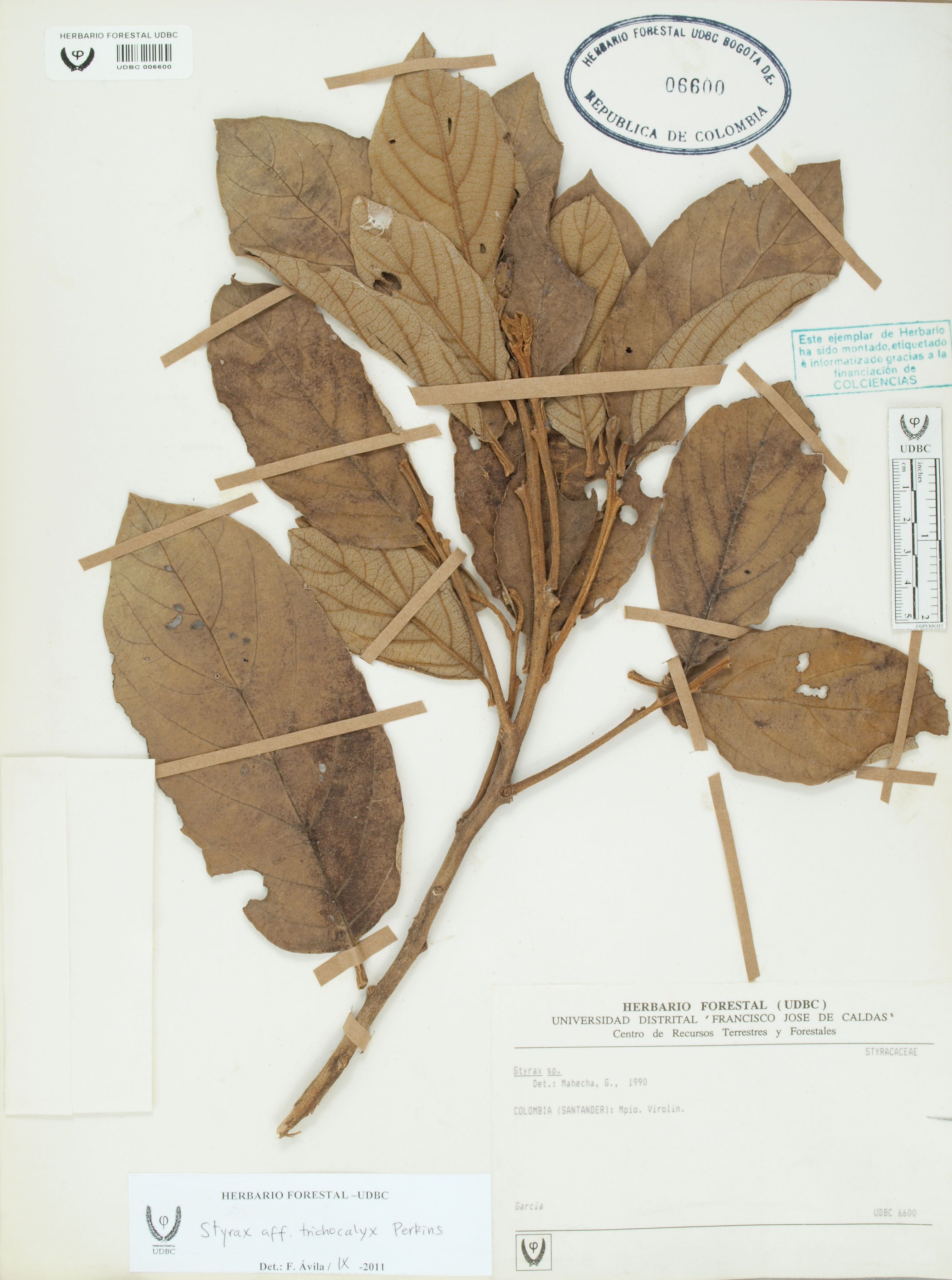 Fotografía del ejemplar SD, determinado como Styrax trichocalyx en el año 2011