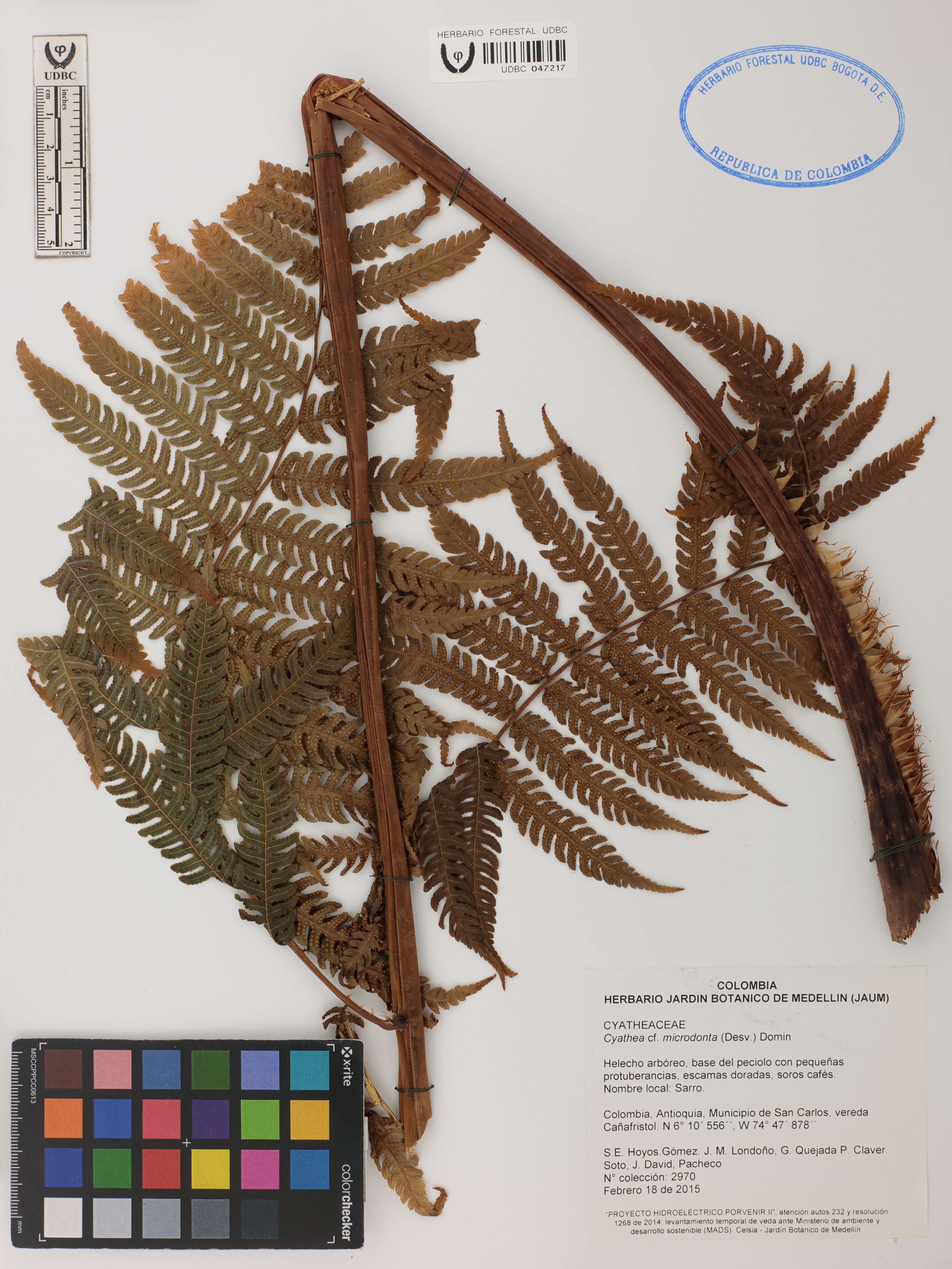 Fotografía del ejemplar Hoyos-Gómez, S. 2970, determinado como Cyathea microdonta