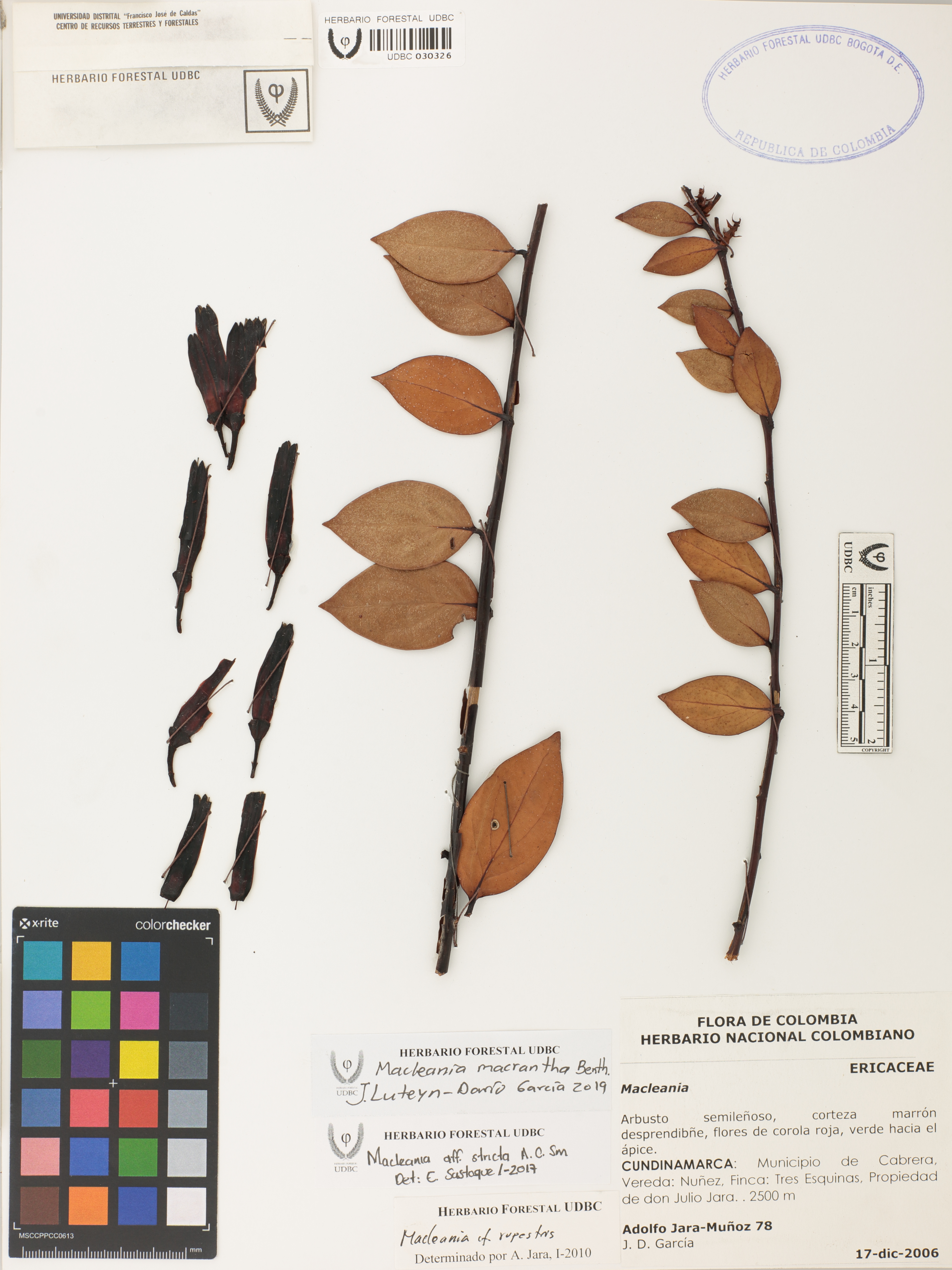 Fotografía del ejemplar Jara-Muñoz, A. 78, determinado como Macleania macrantha en el año 2019