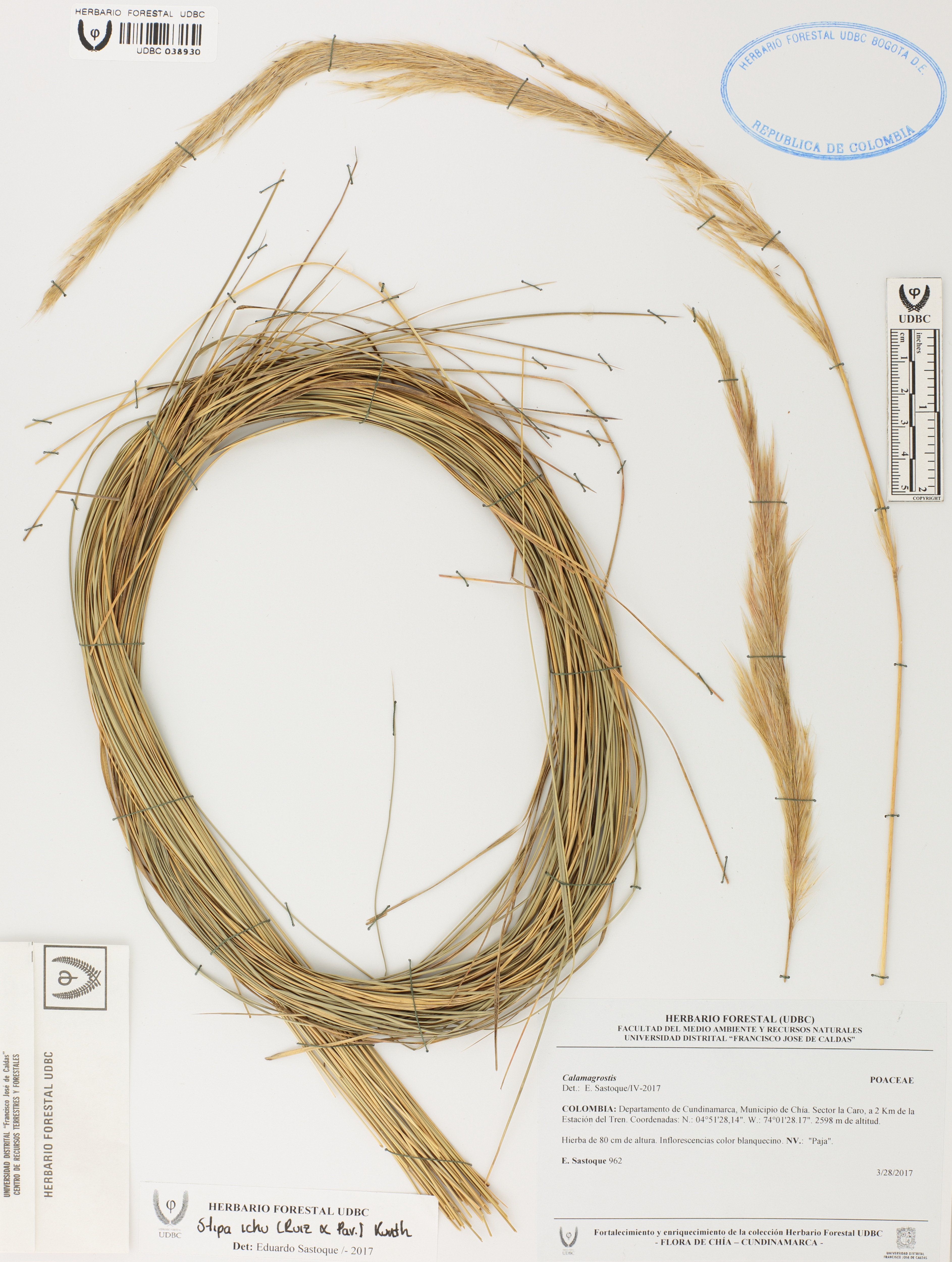 Fotografía del ejemplar Sastoque, E. 962, determinado como Stipa ichu en el año 2017