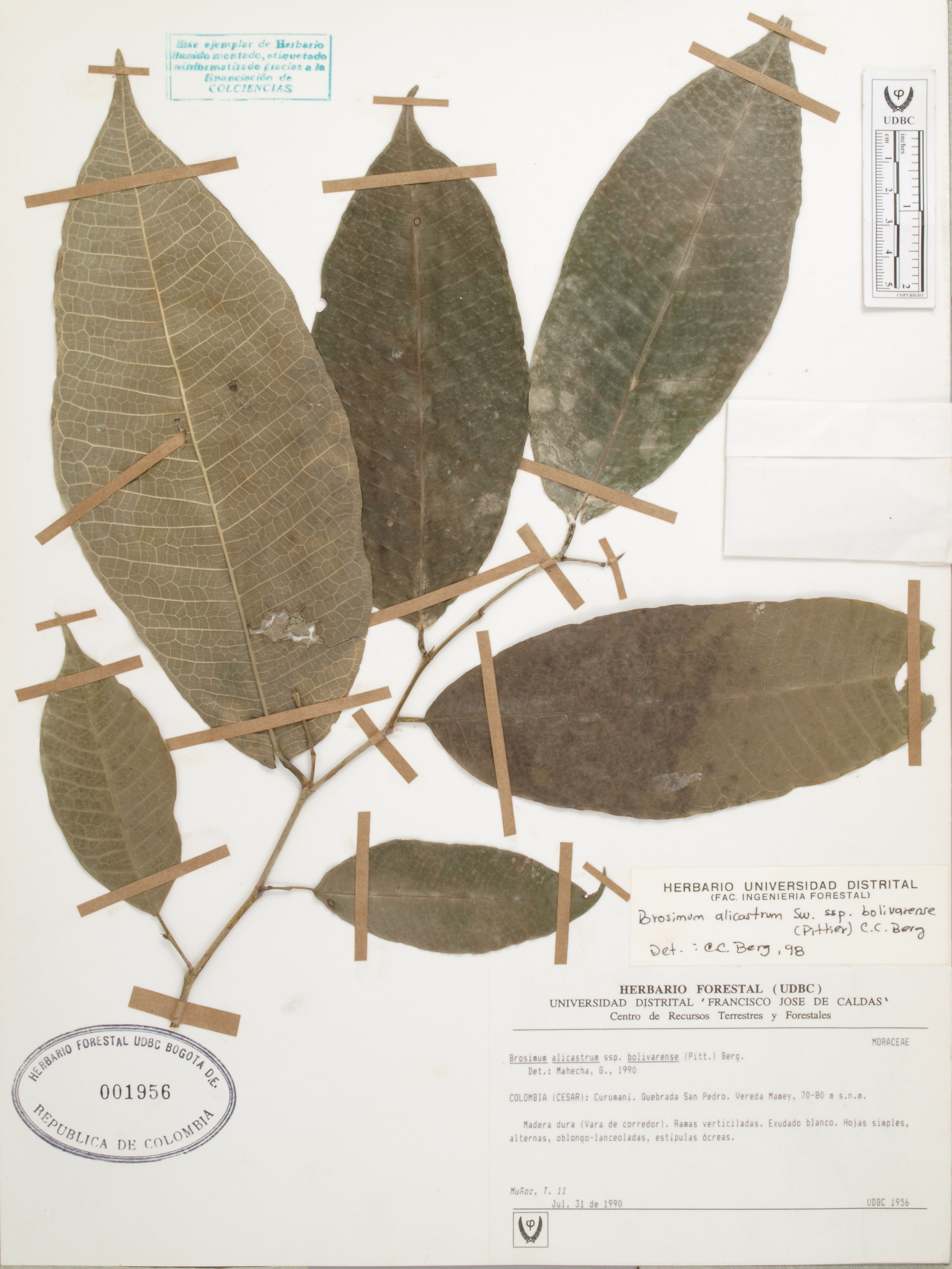 Fotografía del ejemplar Muñoz, T. 11, determinado como Brosimum alicastrum subsp. bolivarense en el año 1998