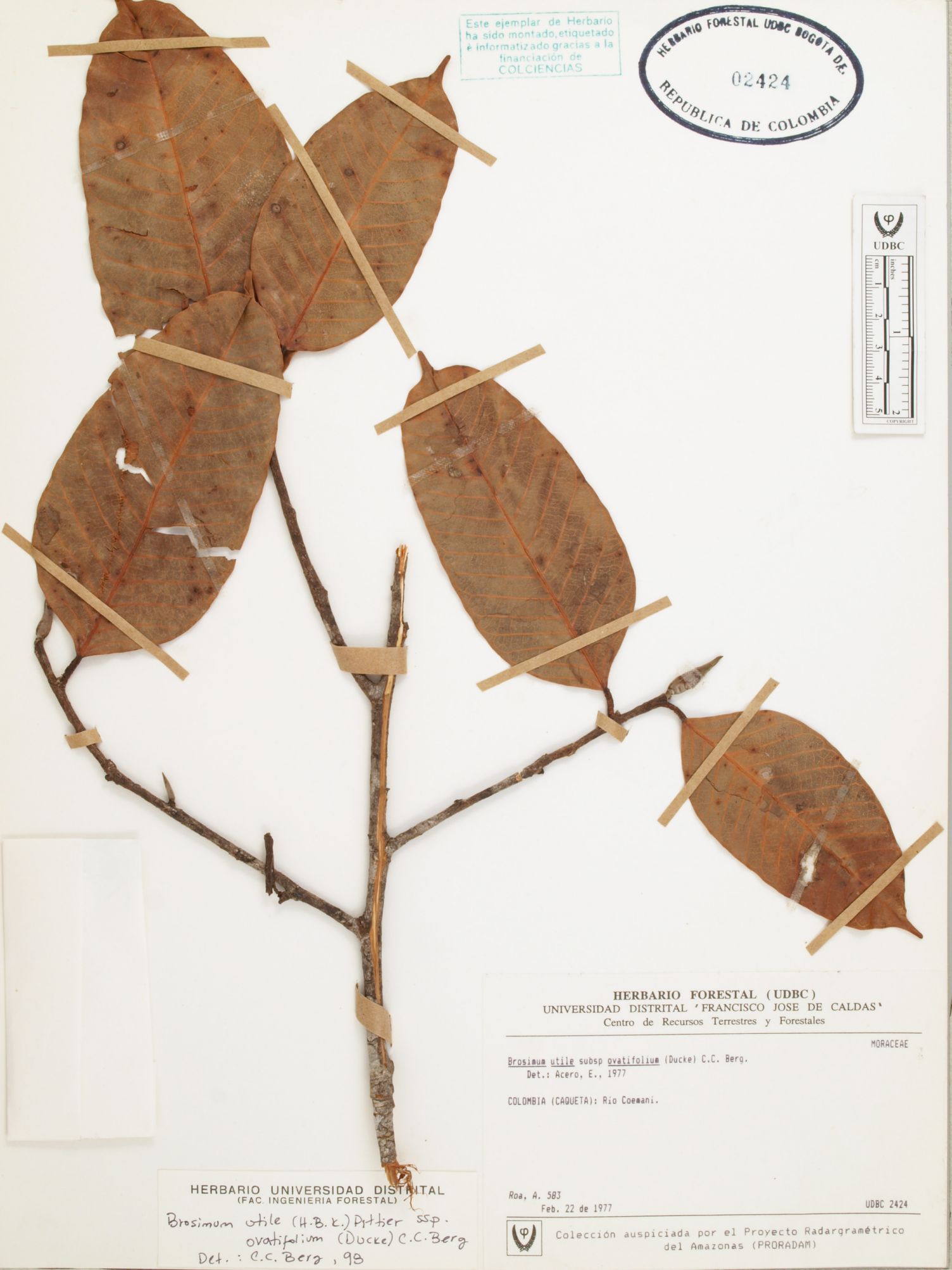 Fotografía del ejemplar Roa, A. 583, determinado como Brosimum utile subsp. ovatifolium en el año 1998