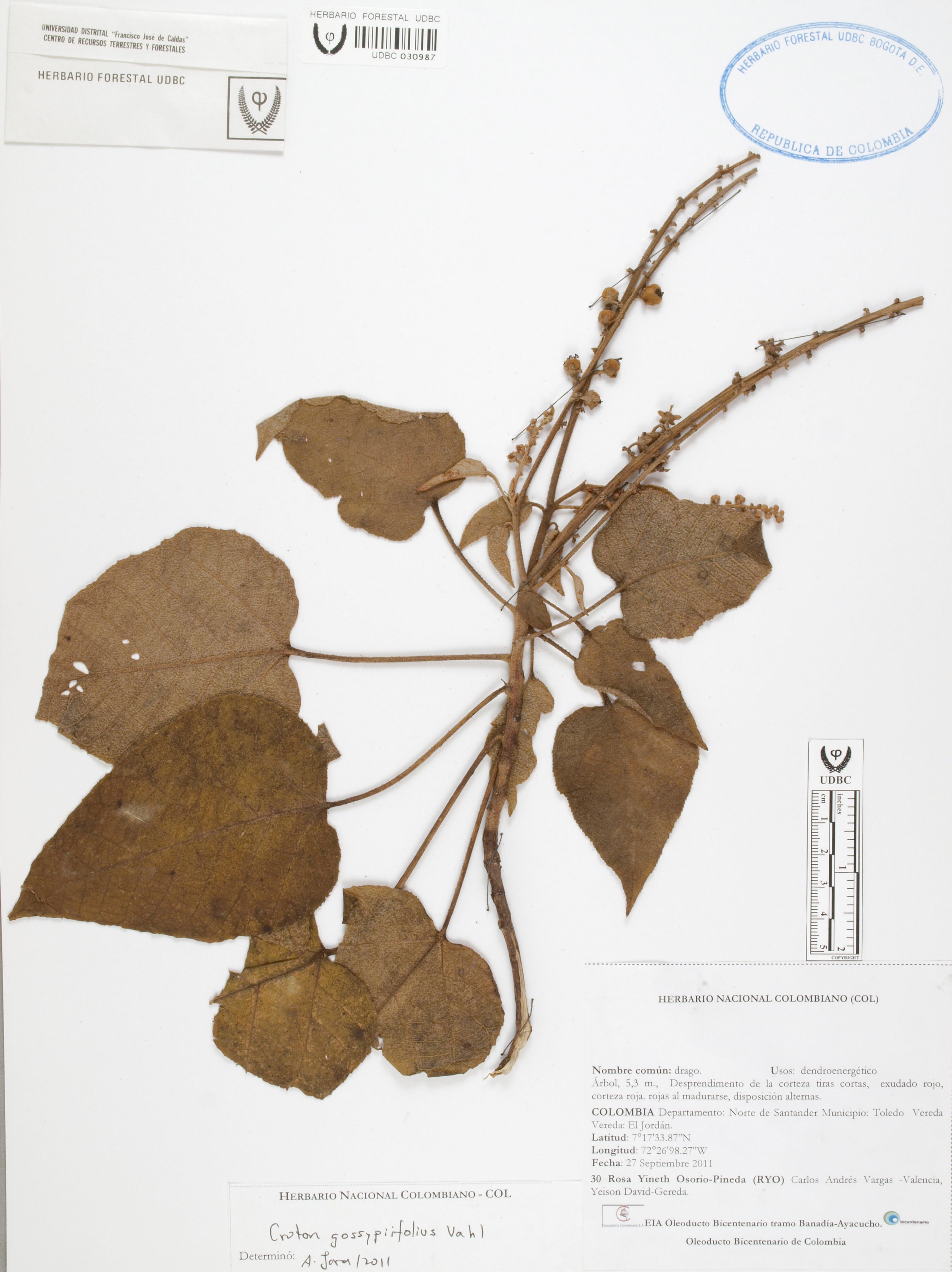 Fotografía del ejemplar Osorio-Pineda, Y. 30, determinado como Croton gossypiifolius en el año 2011