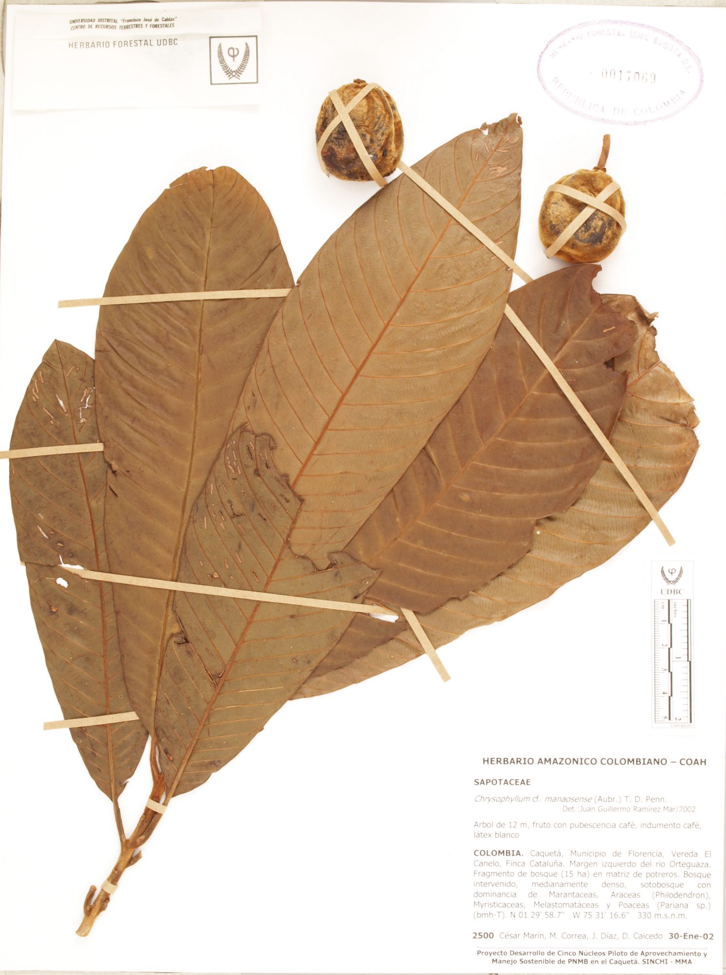Fotografía del ejemplar Marín, C. 2500, determinado como Chrysophyllum manaosense en el año 2002