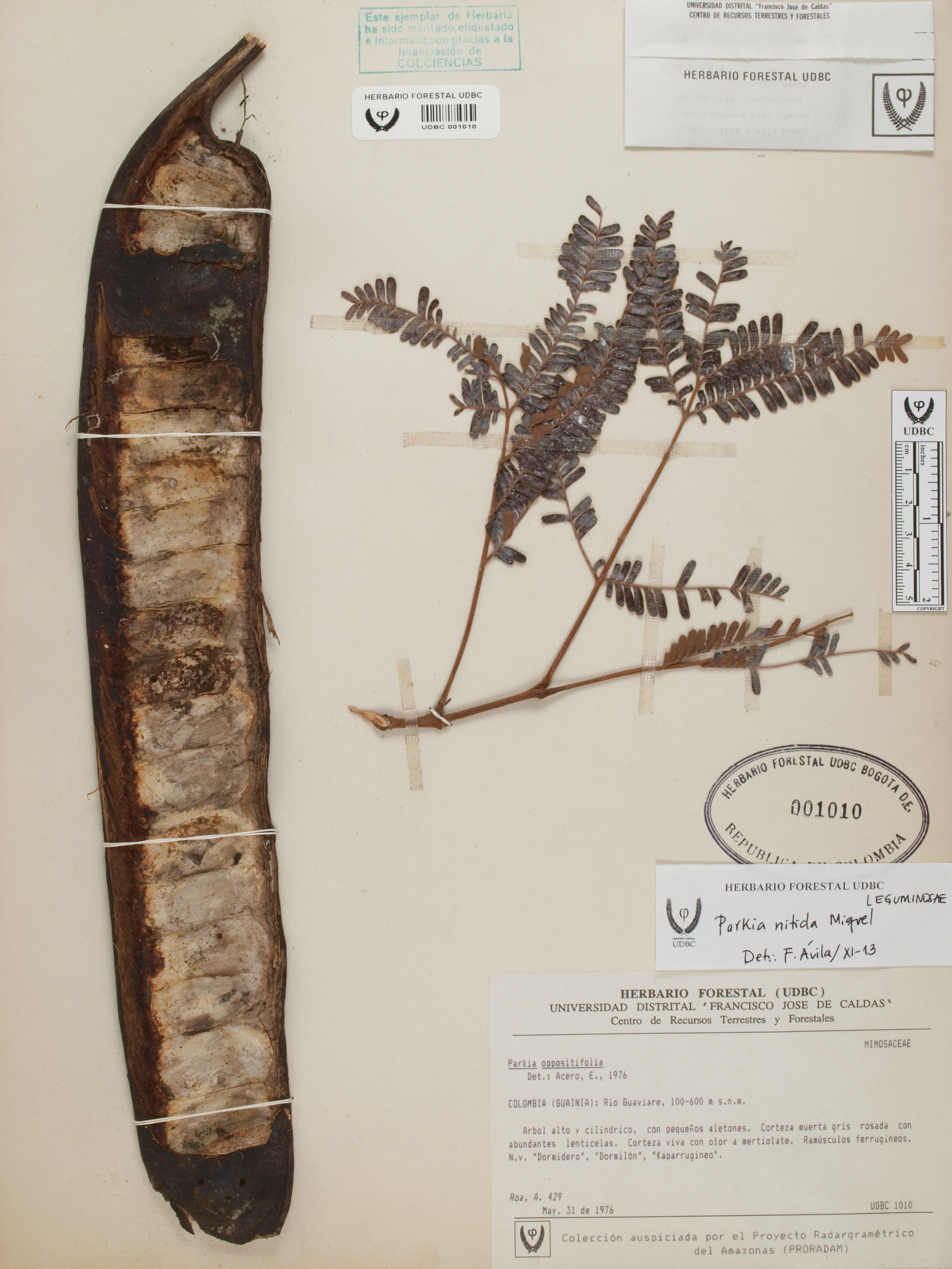 Fotografía del ejemplar Roa, A. 429, determinado como Parkia nitida en el año 2013