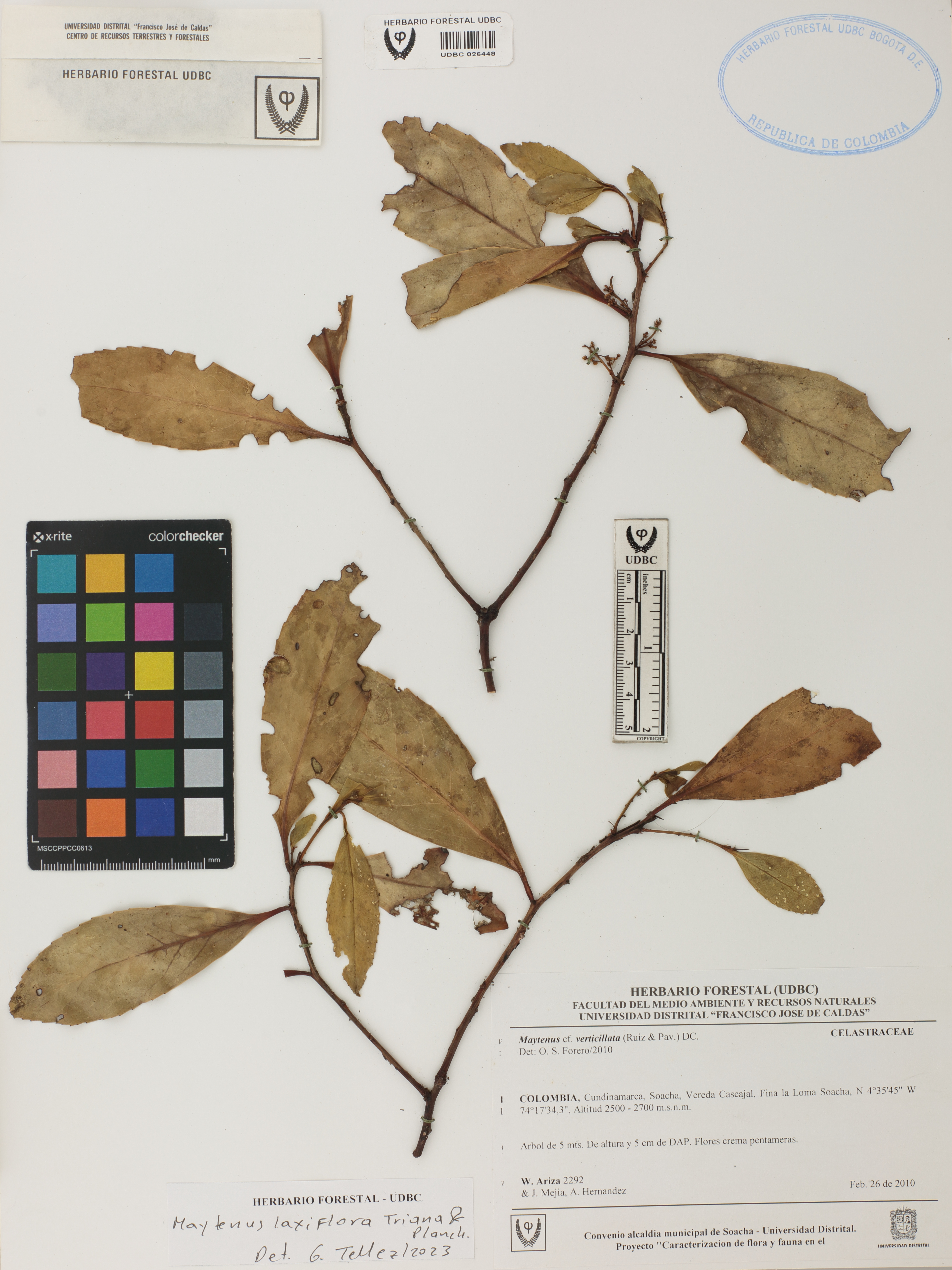 Fotografía del ejemplar Ariza, W. 2292, determinado como Maytenus laxiflora en el año 2023