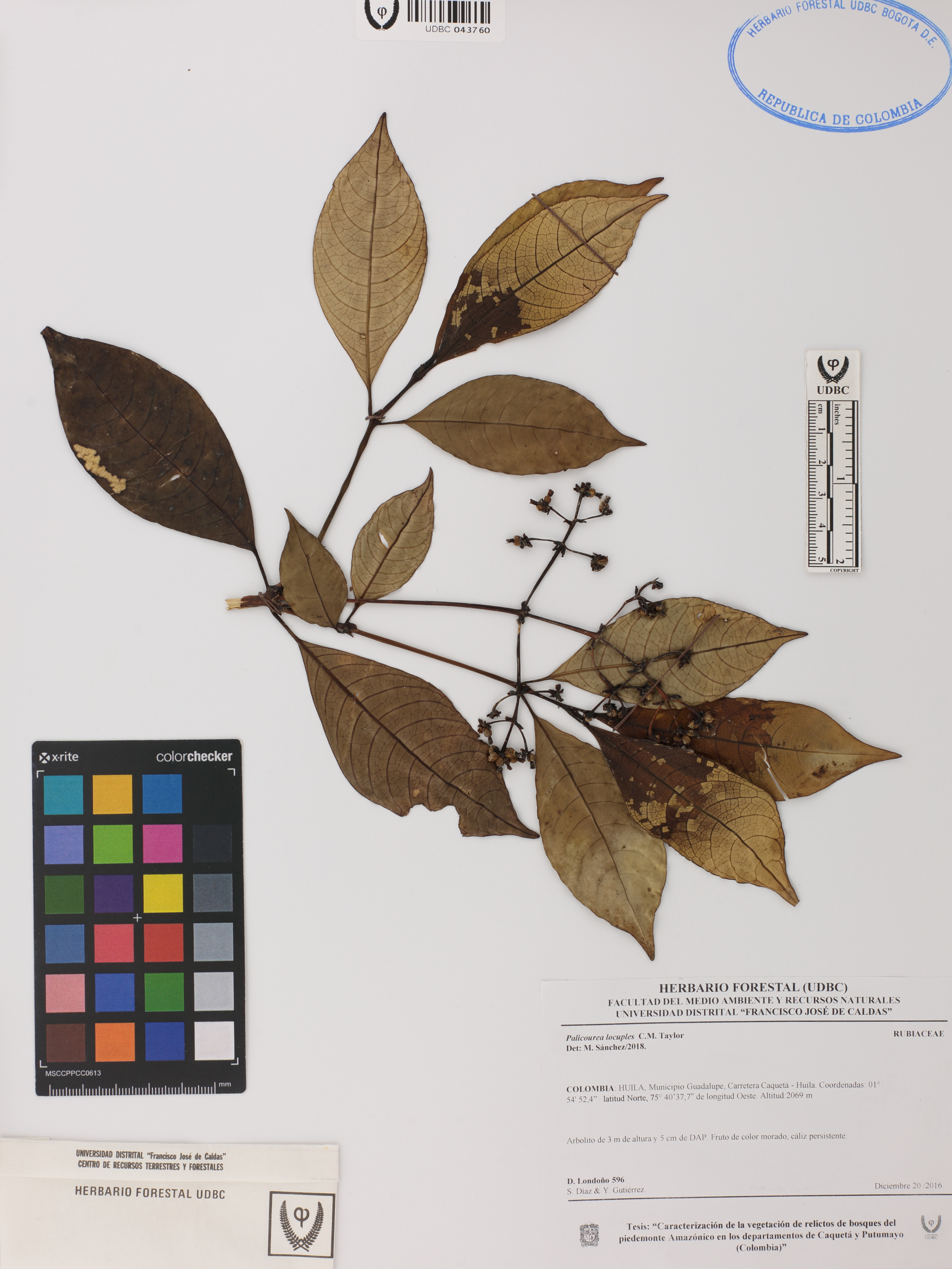 Fotografía del ejemplar Londoño, D. 596, determinado como Palicourea locuples en el año 2018