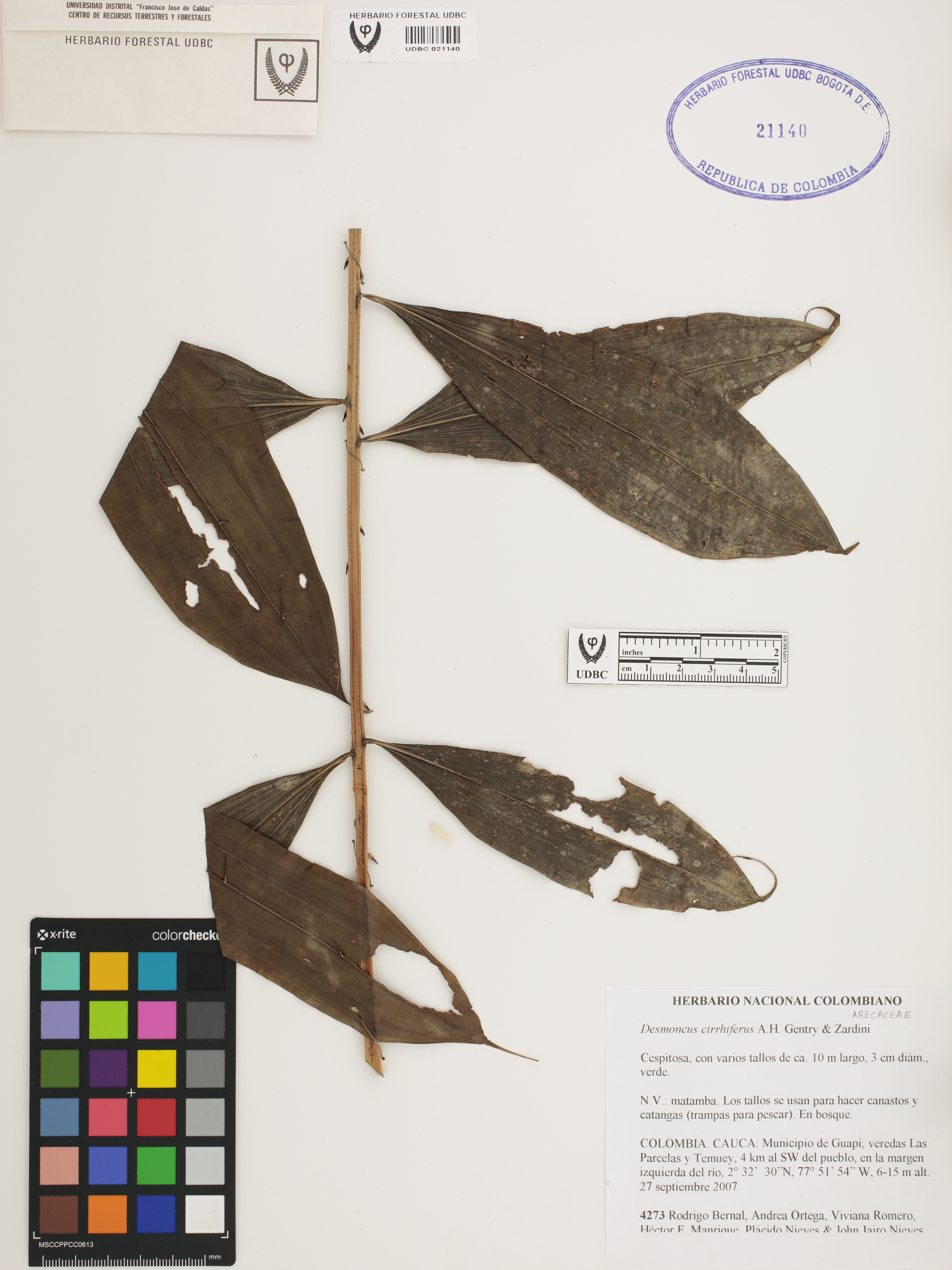 | dc.description | Fotografía del ejemplar Bernal, R. 4273, determinado como Desmoncus cirrhifer | |