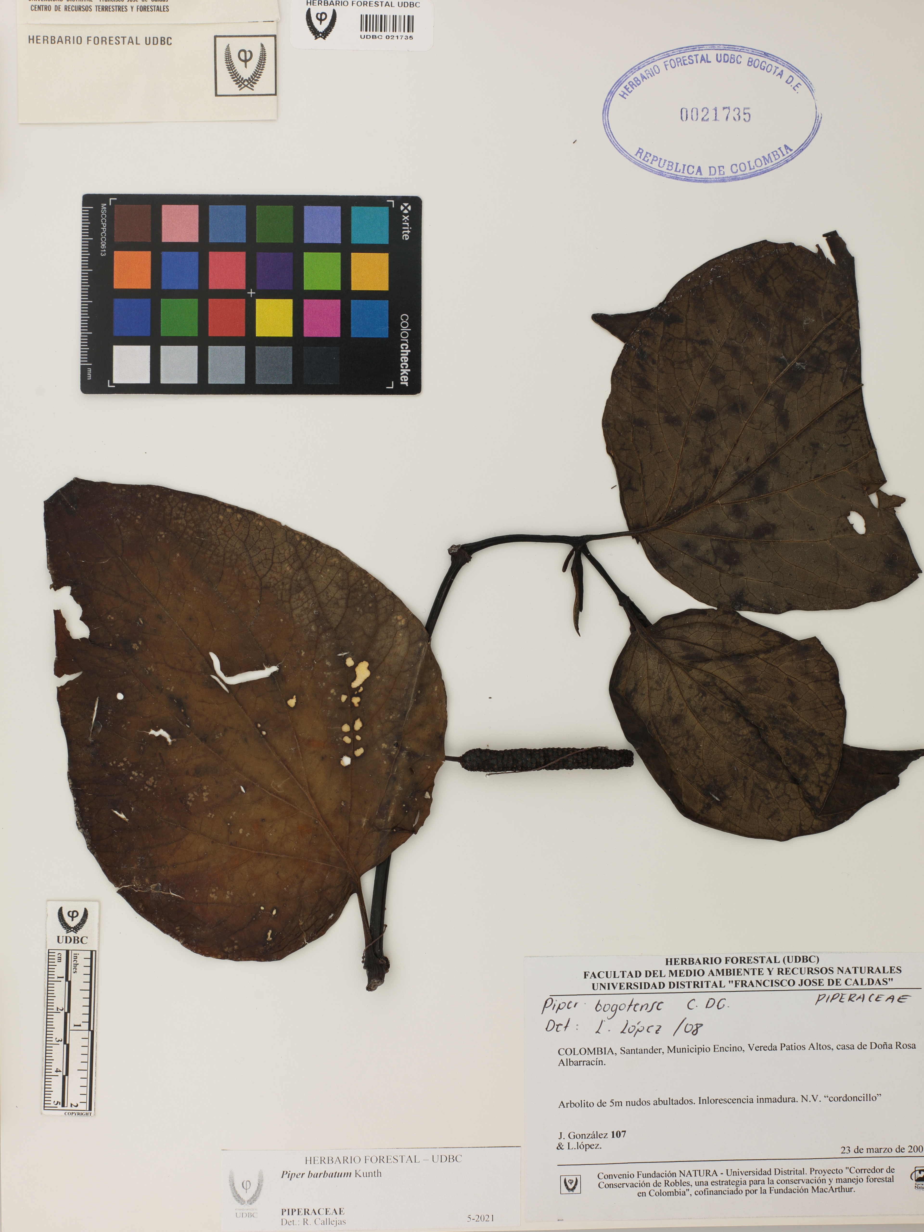 Fotografía del ejemplar González, J. 107, determinado como Piper barbatum en el año 2021