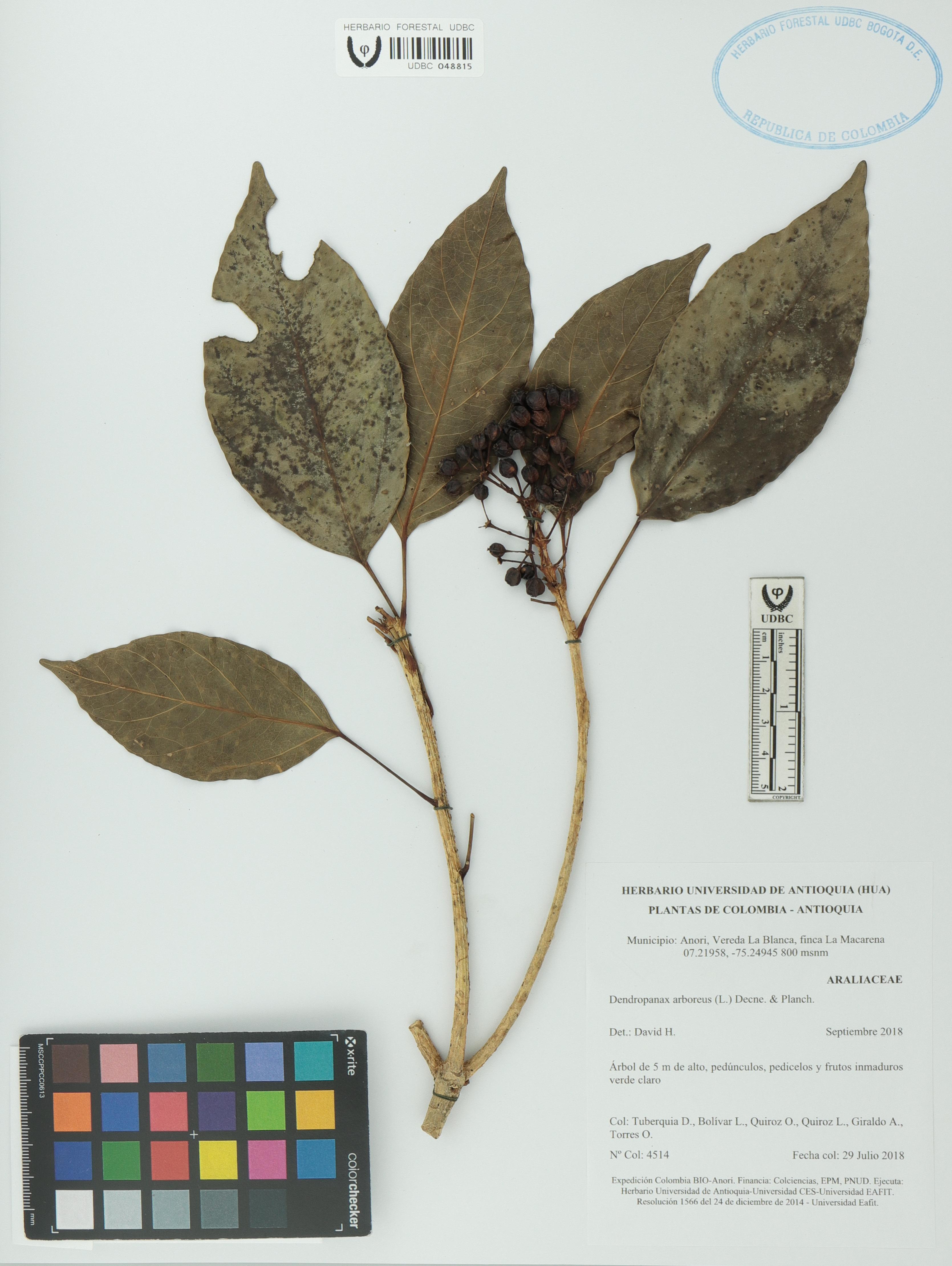 Fotografía del ejemplar Tuberquia, D. 4514, determinado como Dendropanax sp. en el año 2018