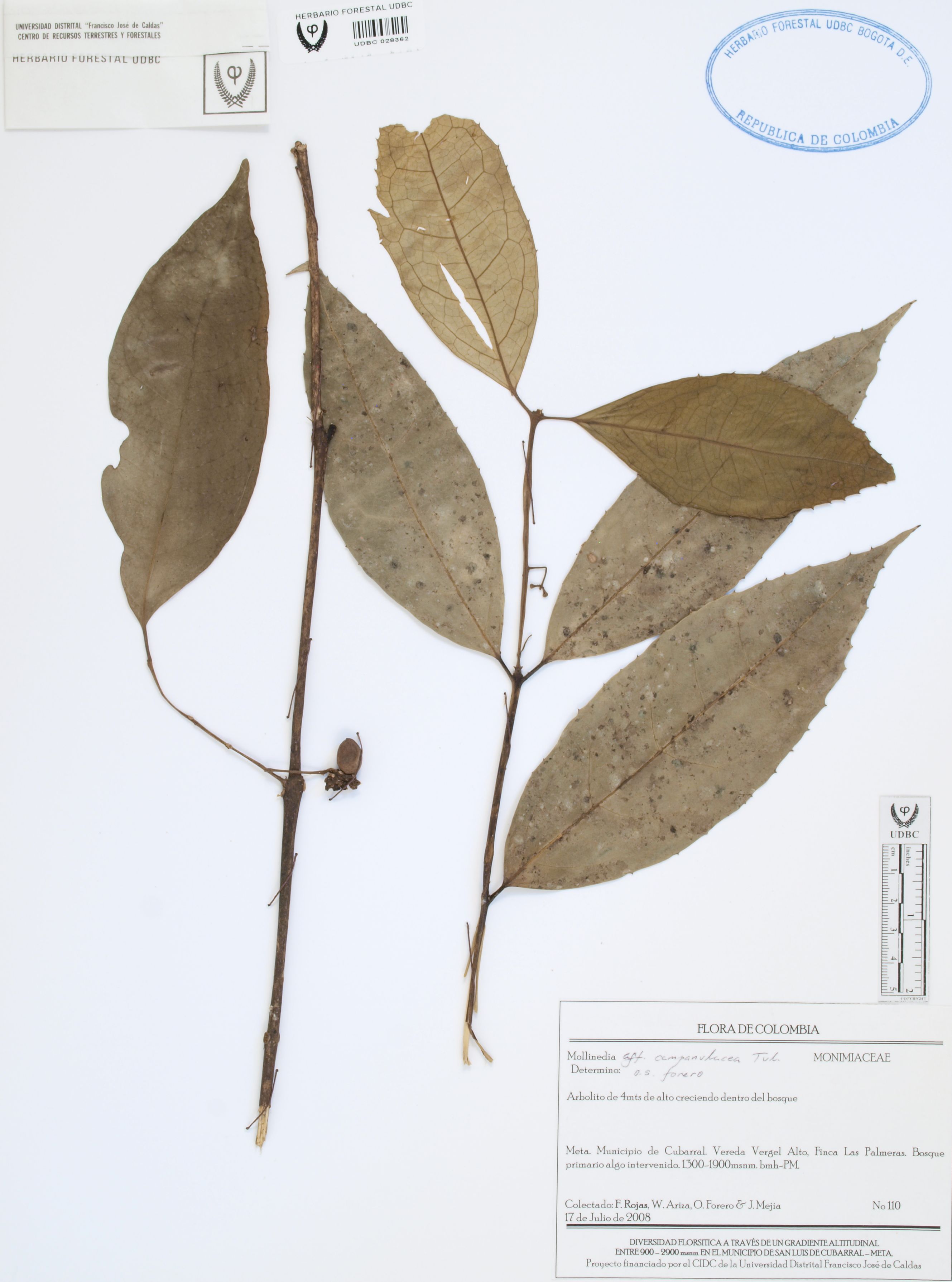 Fotografía del ejemplar Rojas, F. 110, determinado como Mollinedia campanulacea