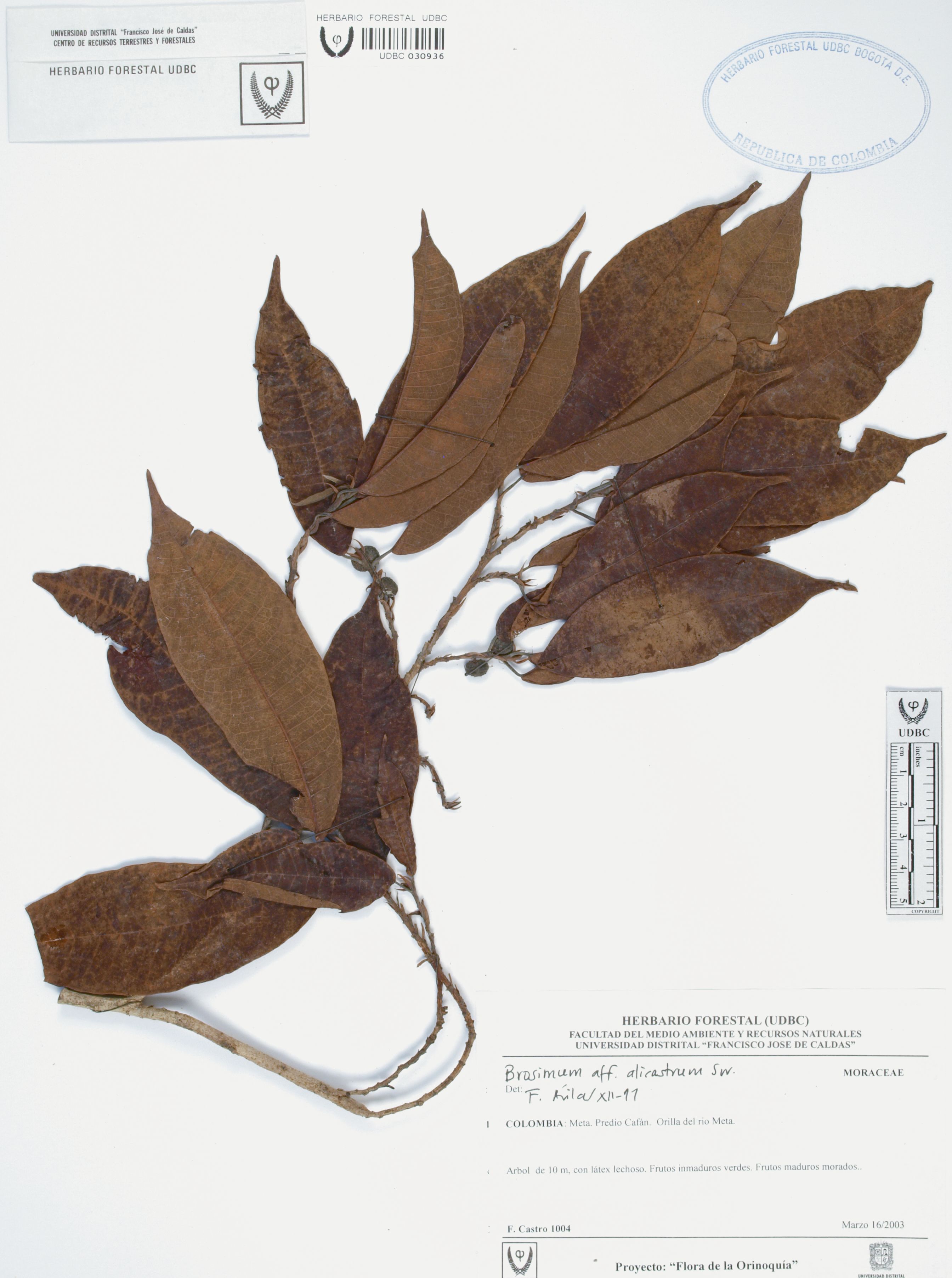 Fotografía del ejemplar Castro, F. 1004, determinado como Brosimum alicastrum en el año 2011