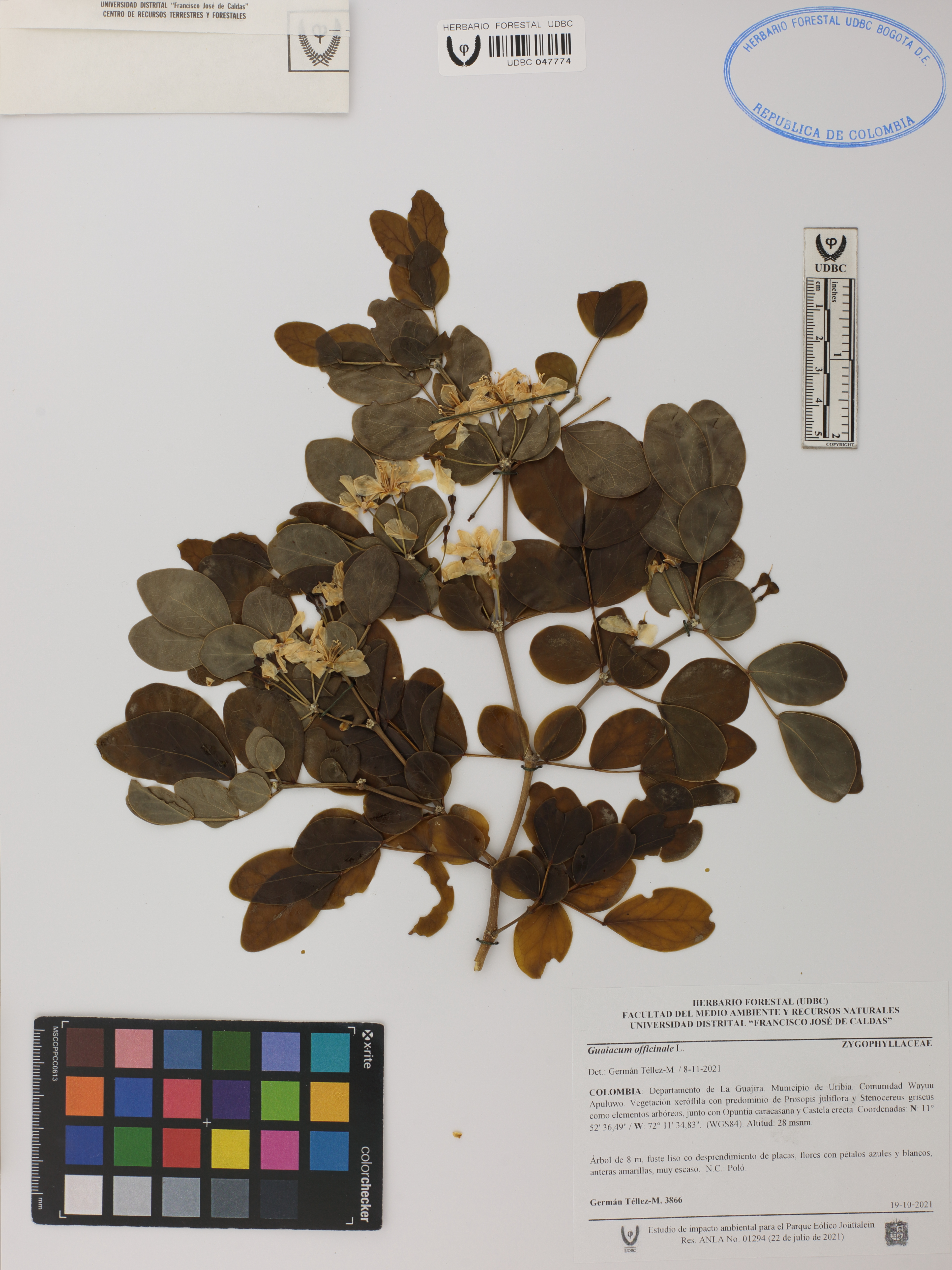 Fotografía del ejemplar Téllez-M., G. 3866, determinado como Guaiacum officinale en el año 2021
