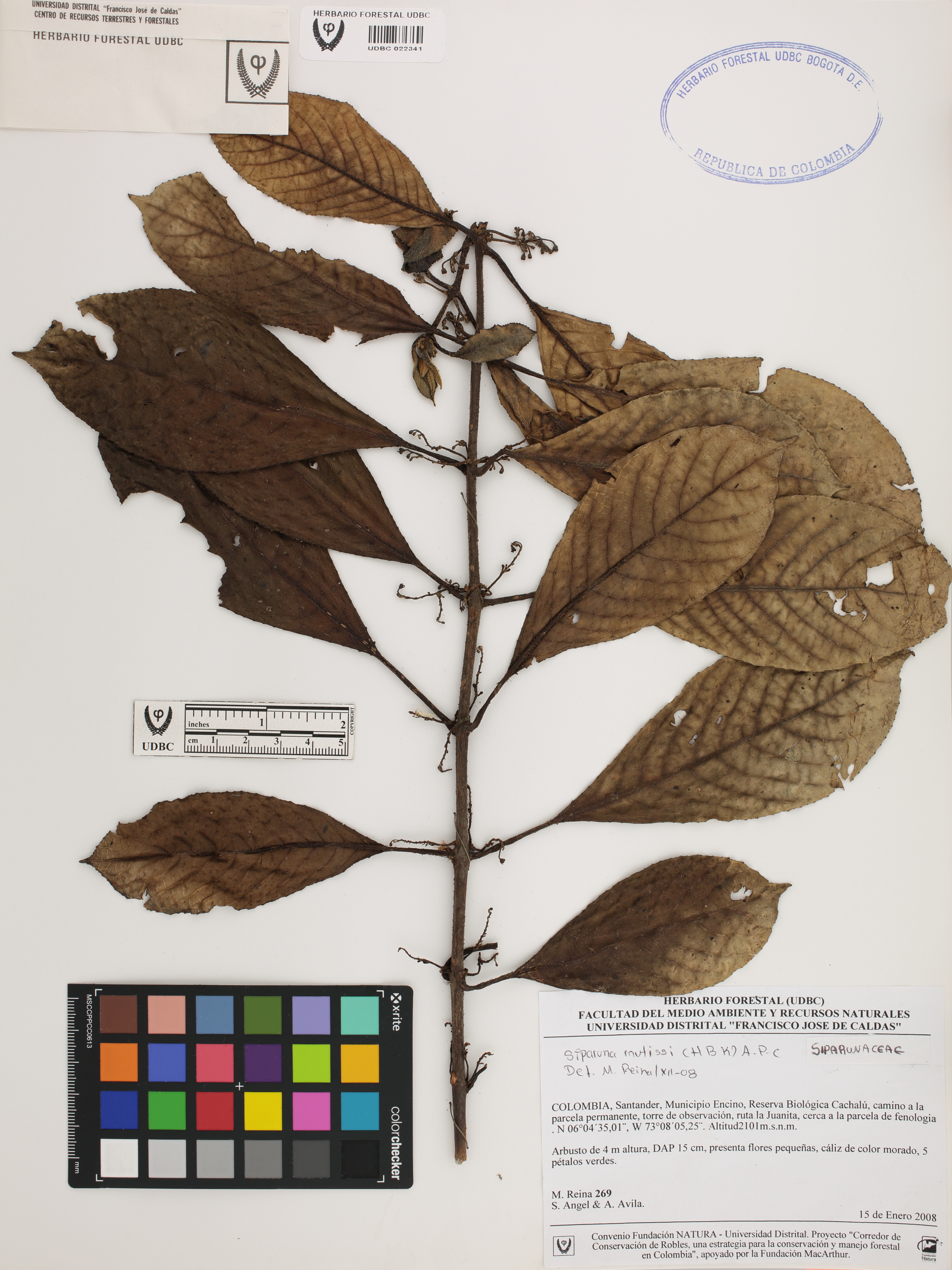 Fotografía del ejemplar Reina, M. 269, determinado como Siparuna mutisii en el año 2008