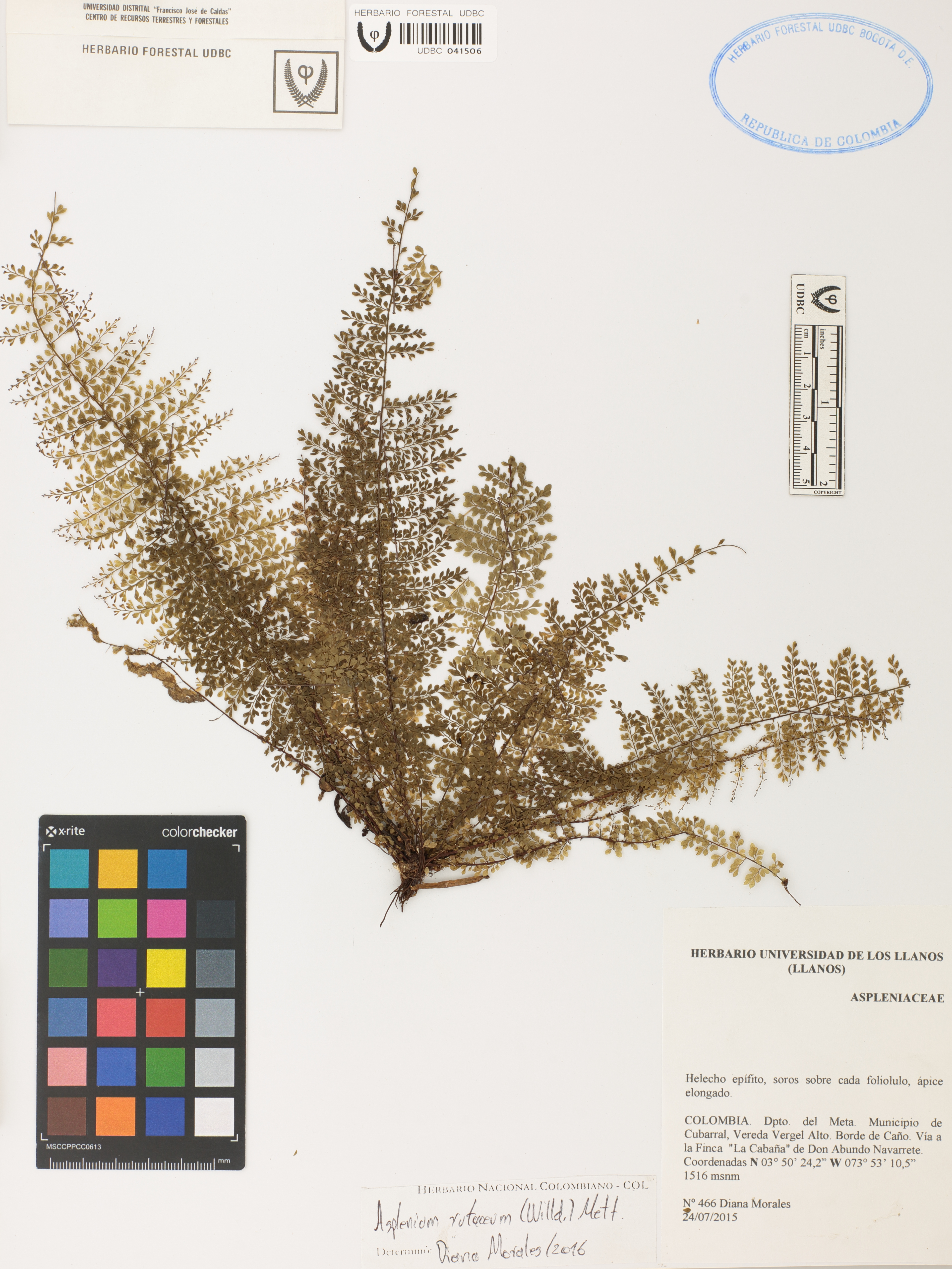 Fotografía del ejemplar Morales, D. 466, determinado como Asplenium rutaceum en el año 2016