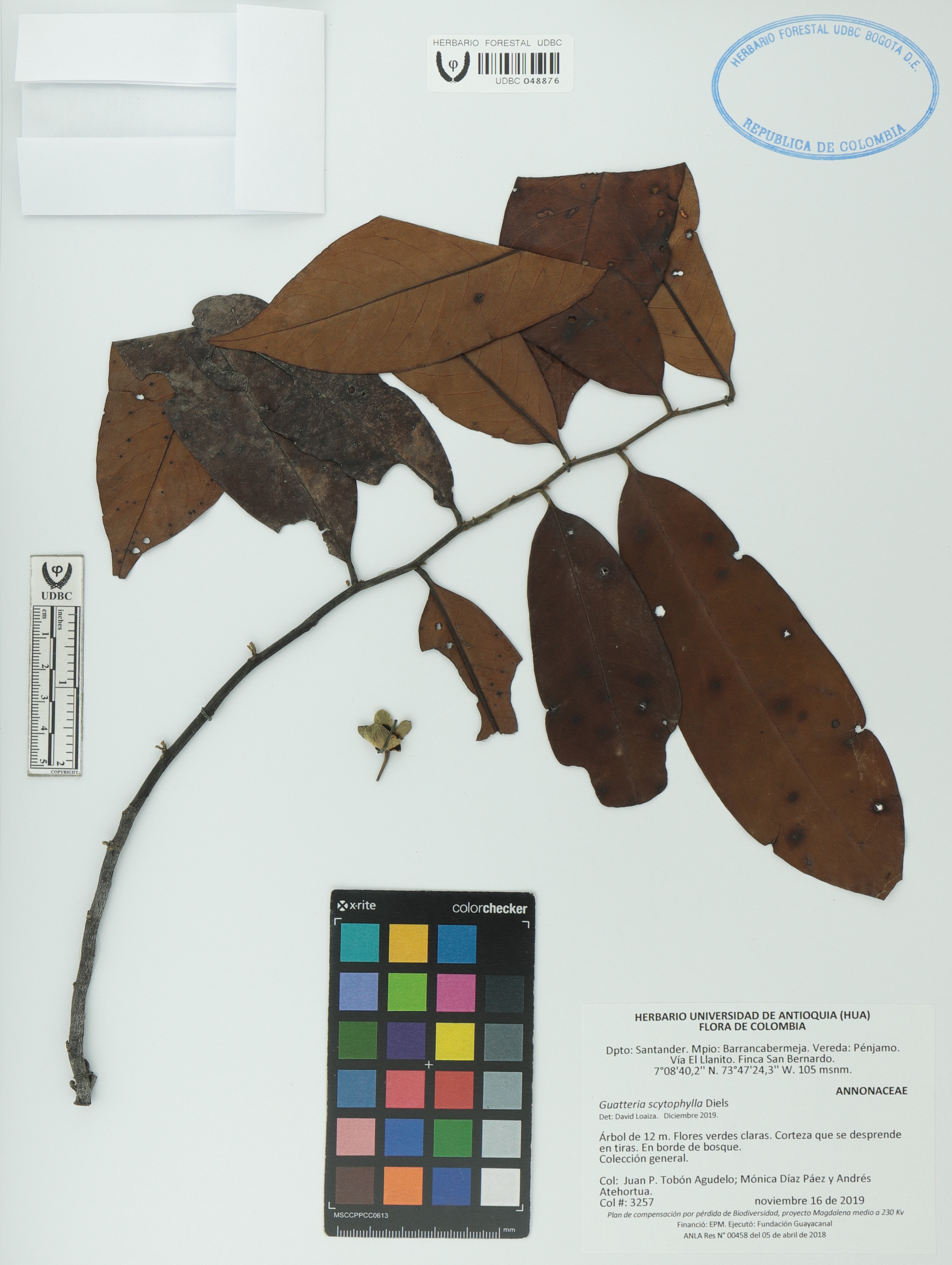 Fotografía del ejemplar Tobón-A., J. 3257, determinado como Guatteria scytophylla en el año 2019