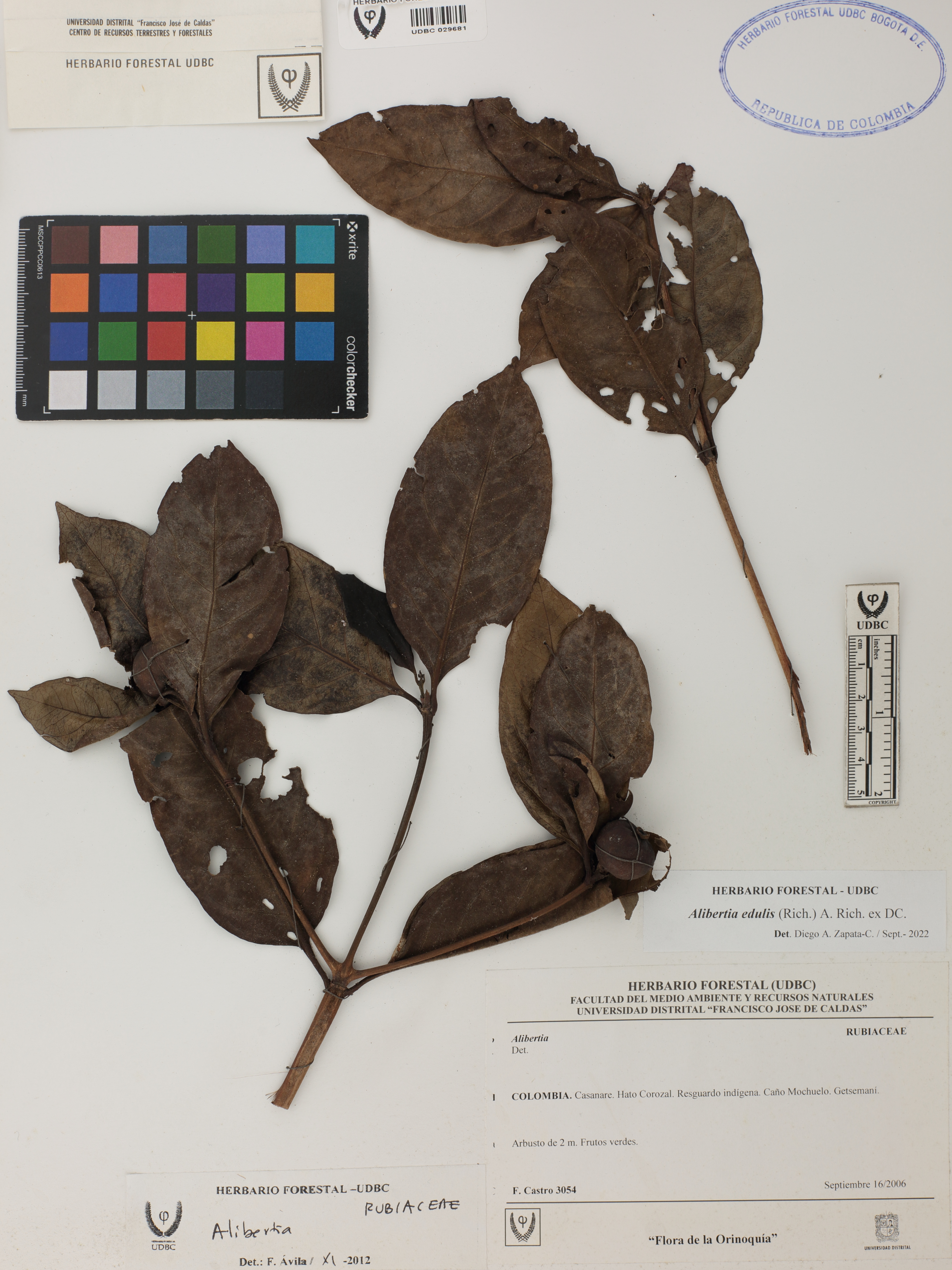 Fotografía del ejemplar Castro, F. 3054, determinado como Alibertia edulis en el año 2022