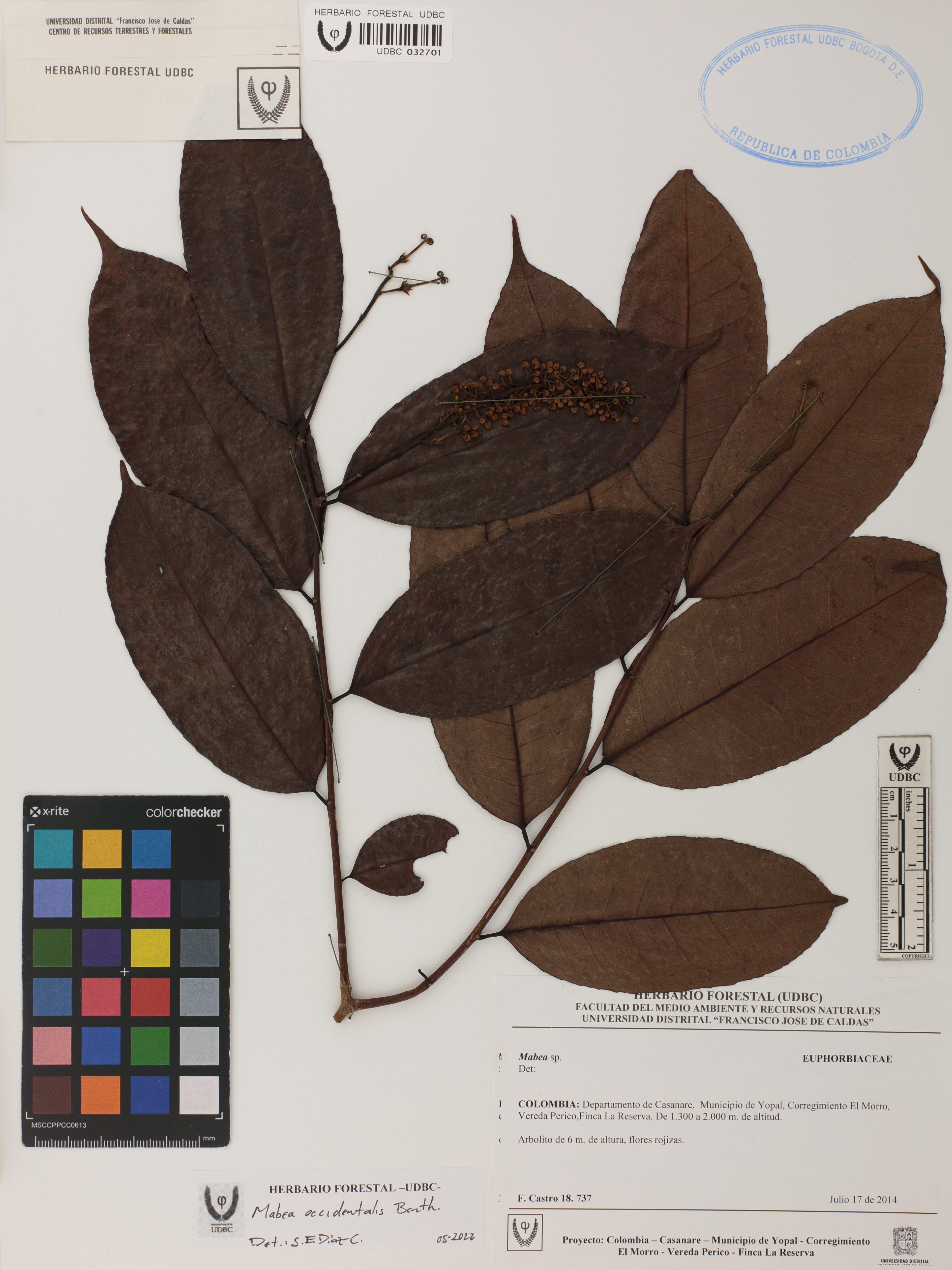 Fotografía del ejemplar Castro, F. 18737, determinado como Mabea occidentalis en el año 2022