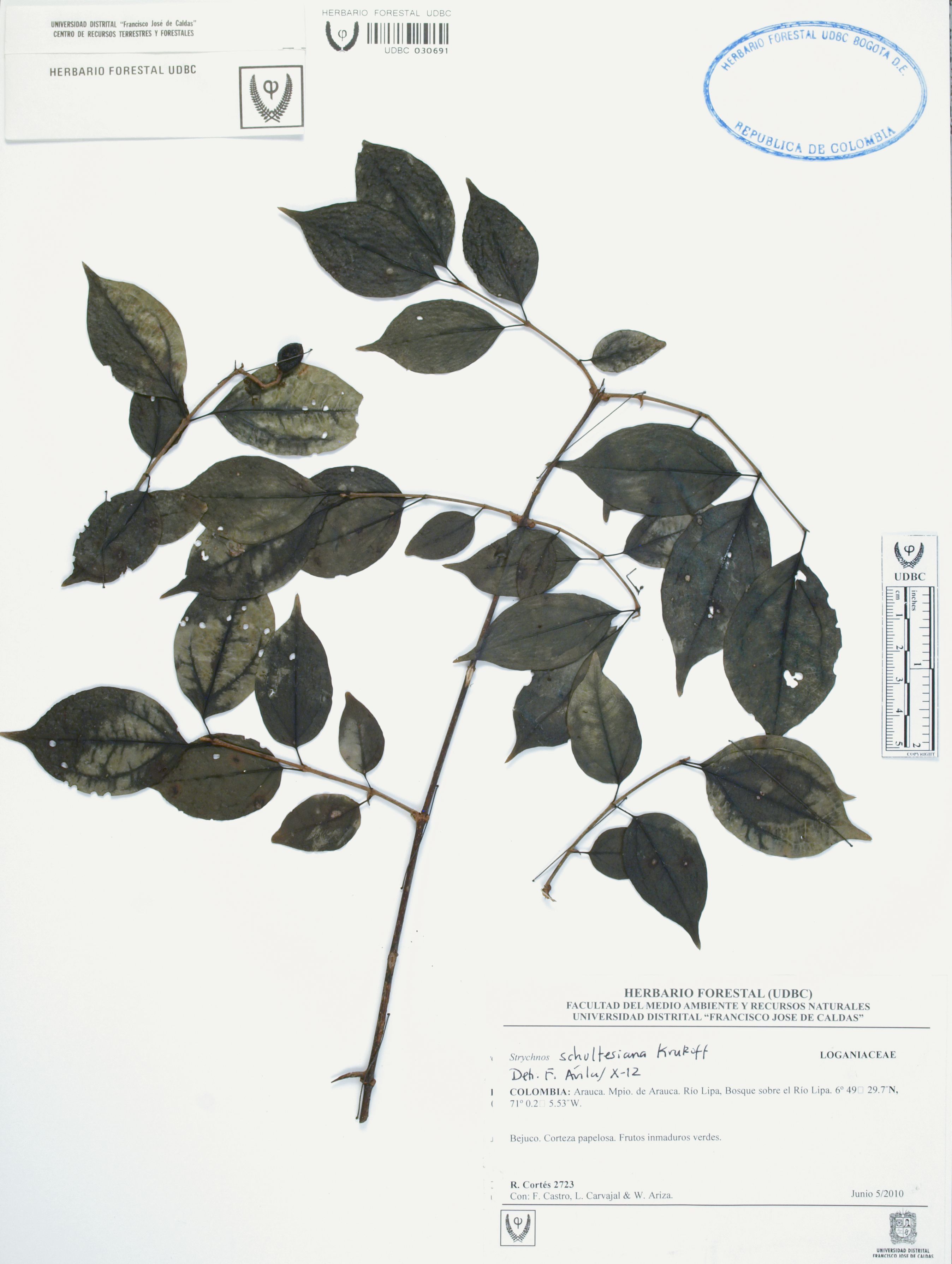 Fotografía del ejemplar Cortés-B., R. 2723, determinado como Strychnos schultesiana en el año 2012