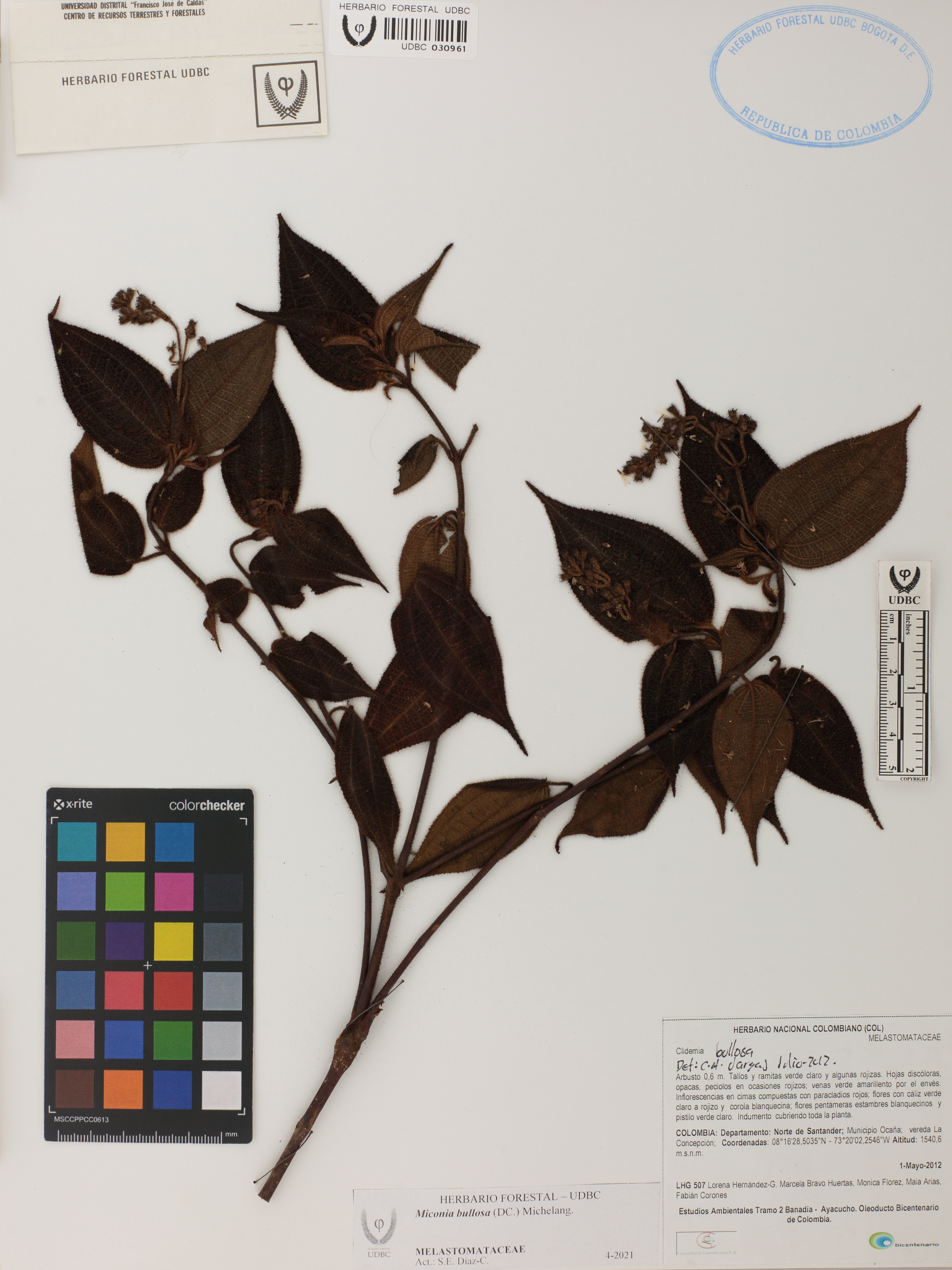 Fotografía del ejemplar Hernández-G., L. 507, determinado como Miconia bullosa en el año 2012