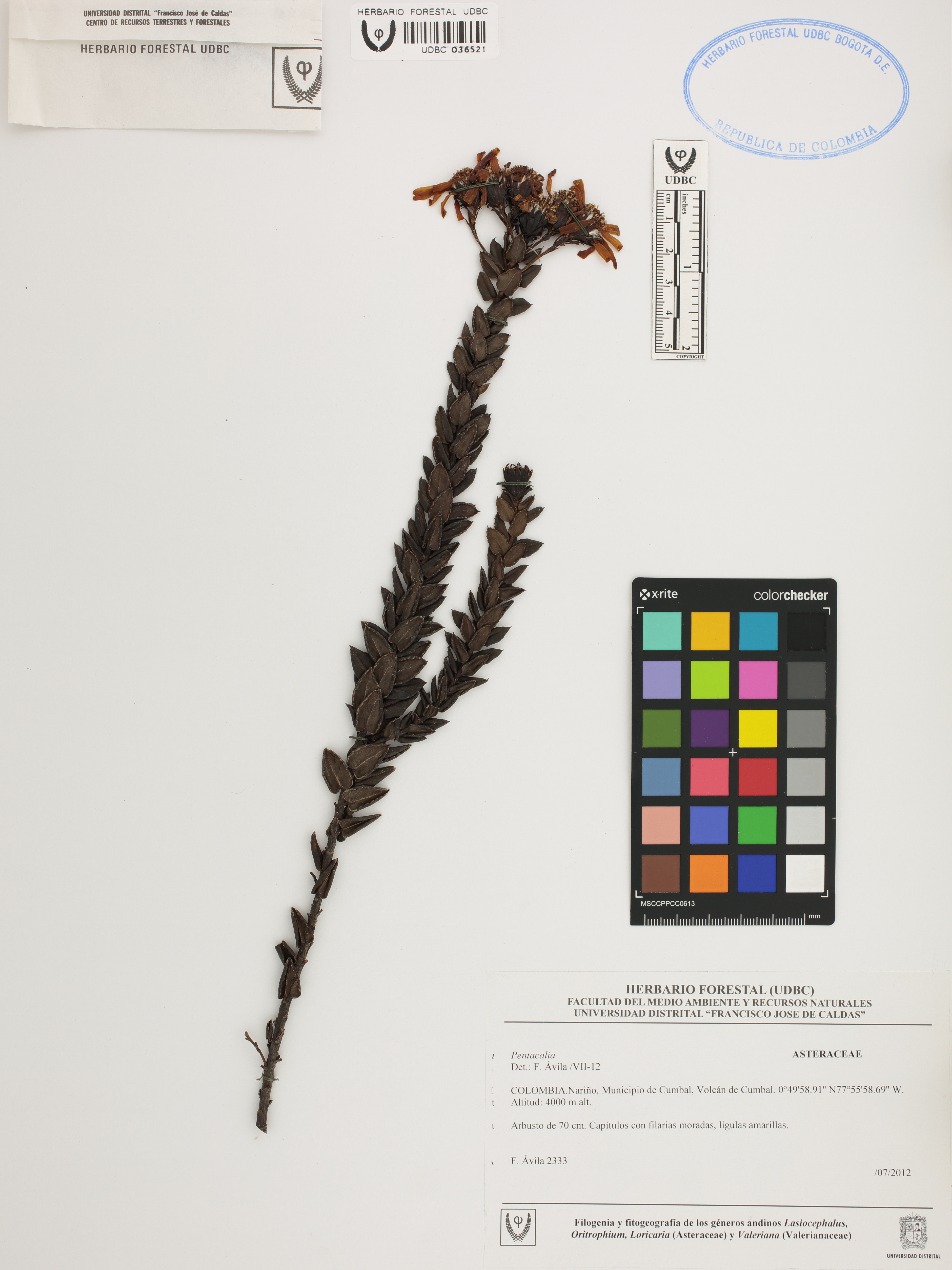 Fotografía del ejemplar Ávila, F. 2333, determinado como Pentacalia sp. en el año 2012