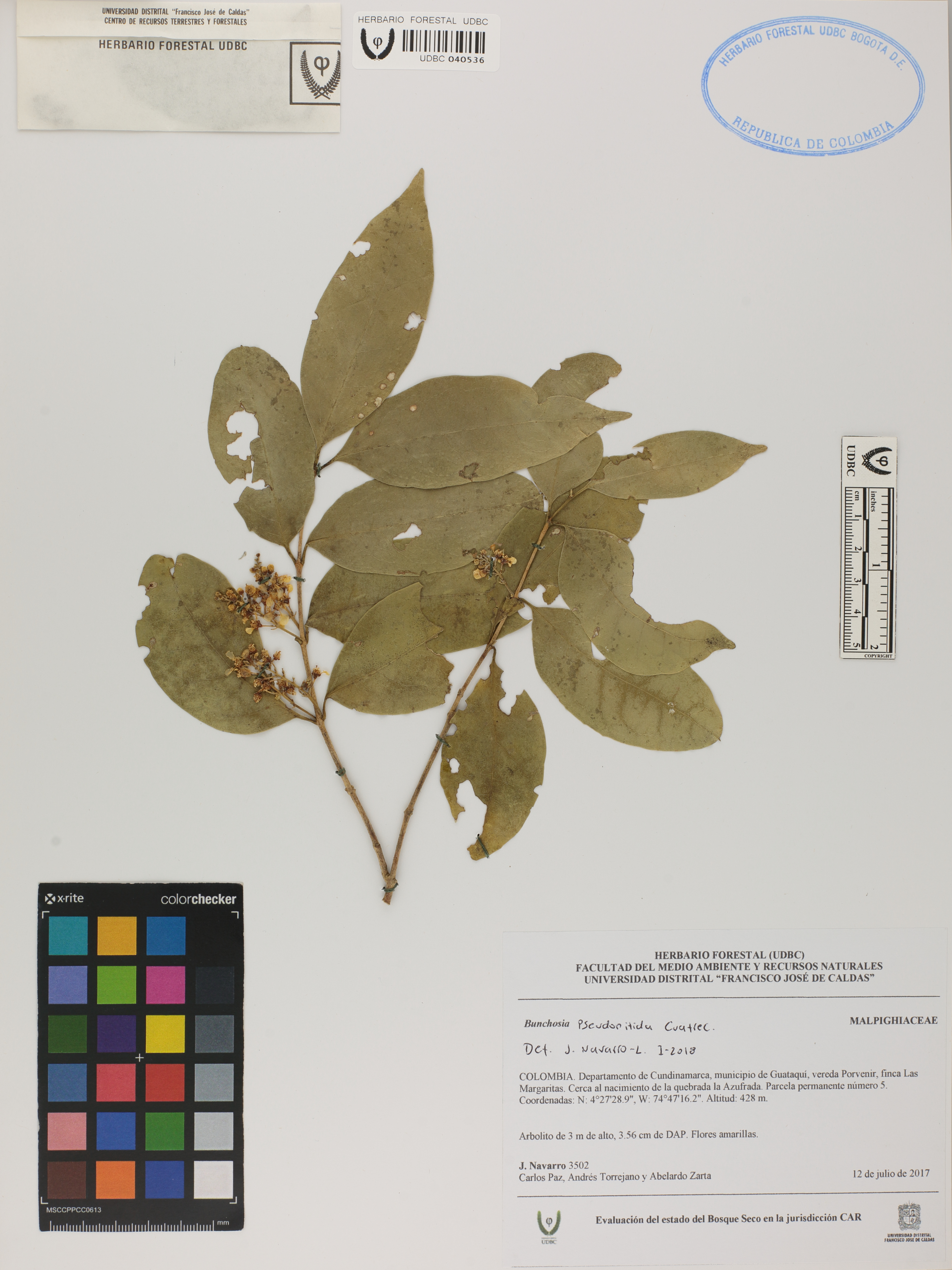 Fotografía del ejemplar Navarro, J. 3502, determinado como Bunchosia pseudonitida en el año 2018