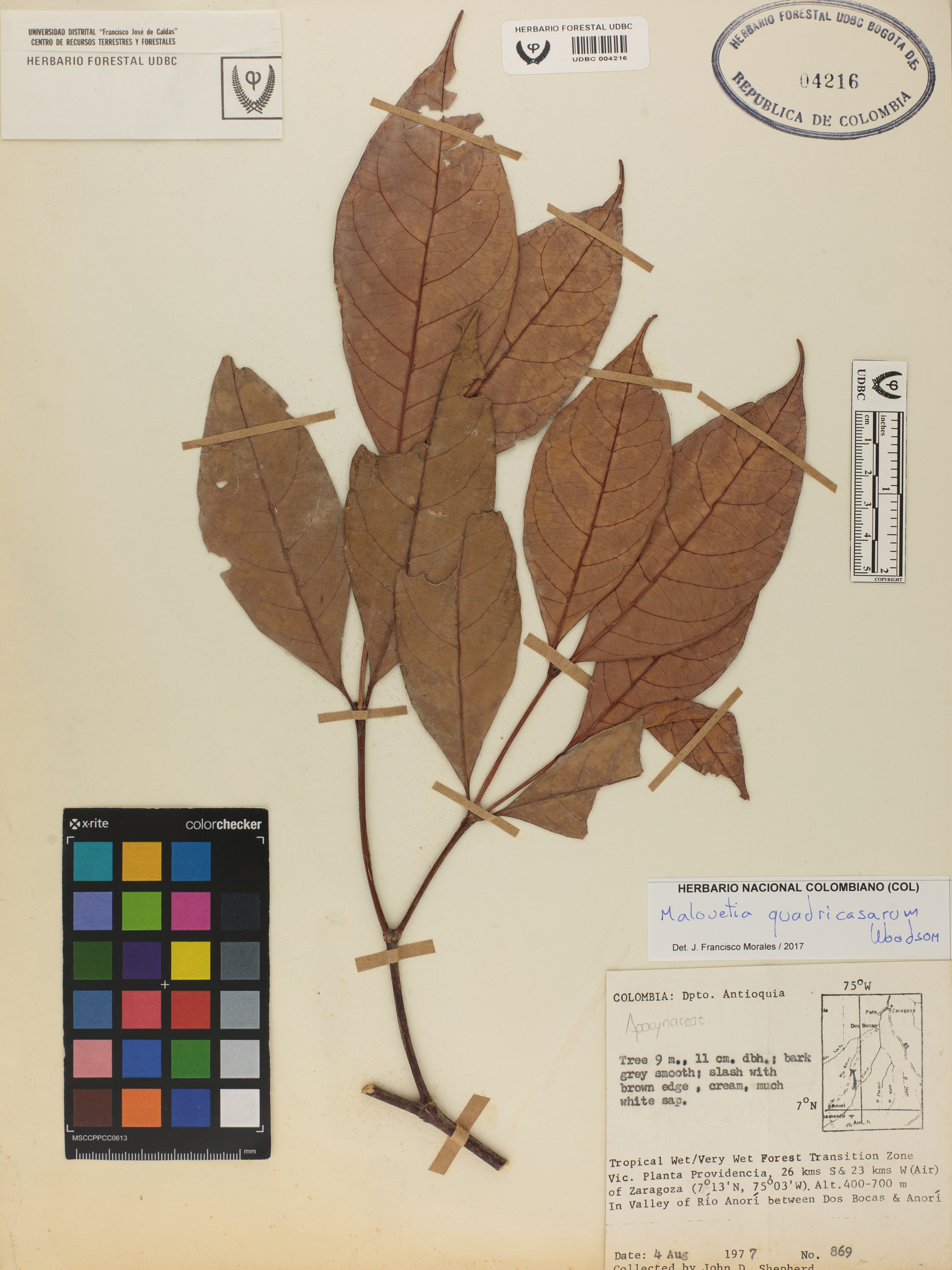 Fotografía del ejemplar Shepherd, J. 869, determinado como Malouetia quadricasarum en el año 2017