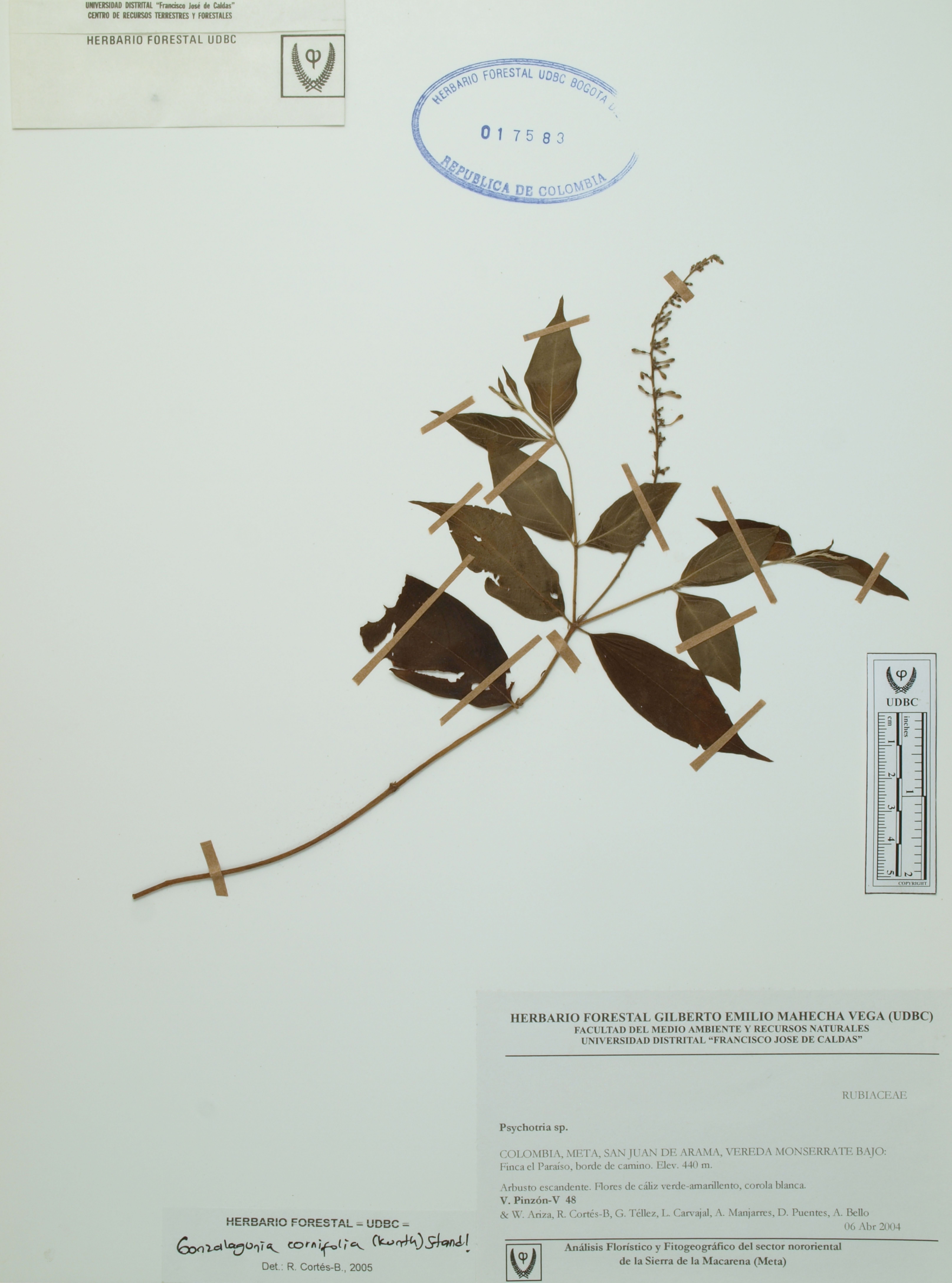 Fotografía del ejemplar Pinzón, V. 48, determinado como Gonzalagunia cornifolia en el año 2005