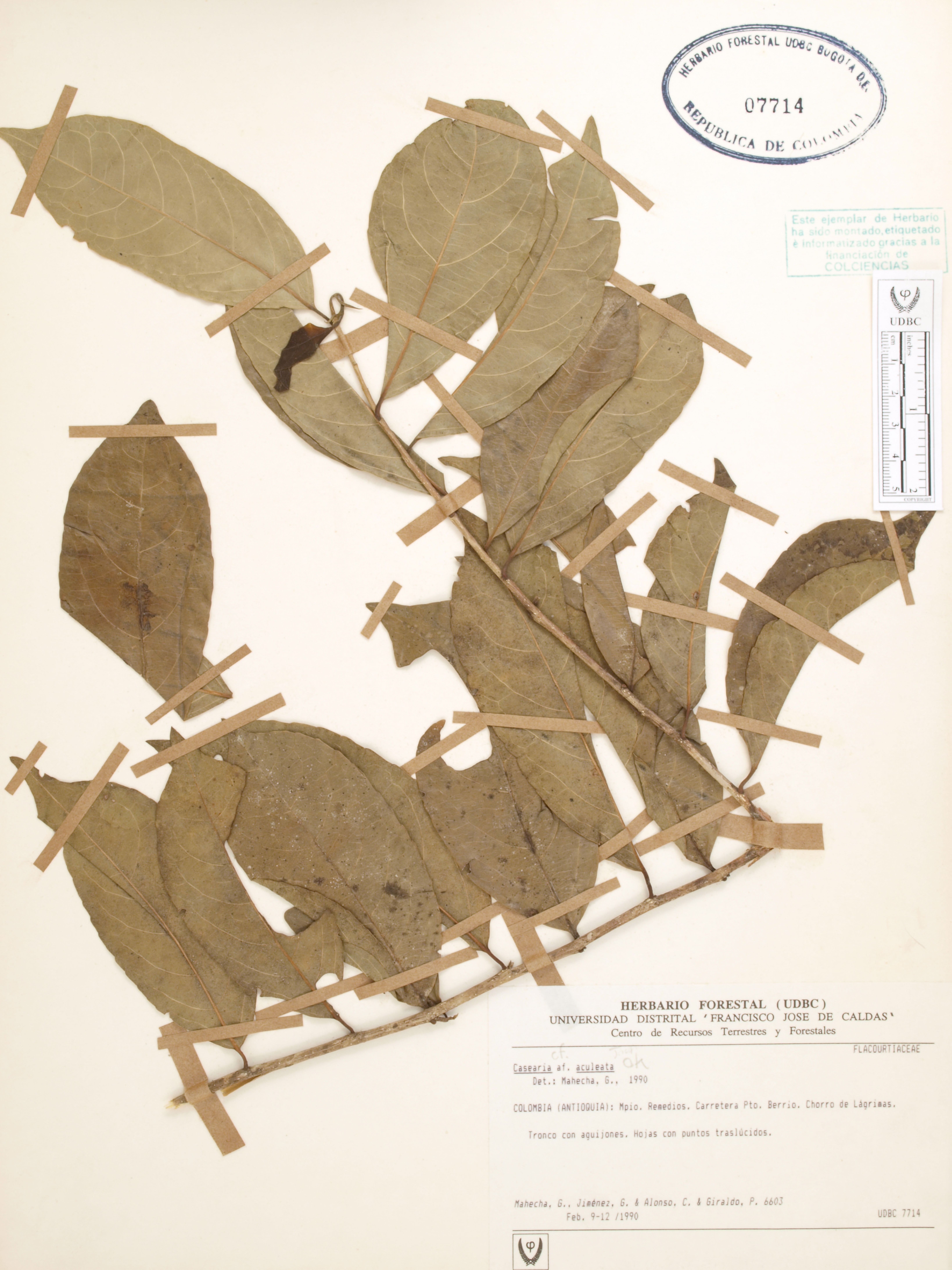 Fotografía del ejemplar Mahecha, G. 6603, determinado como Casearia aculeata en el año 1990