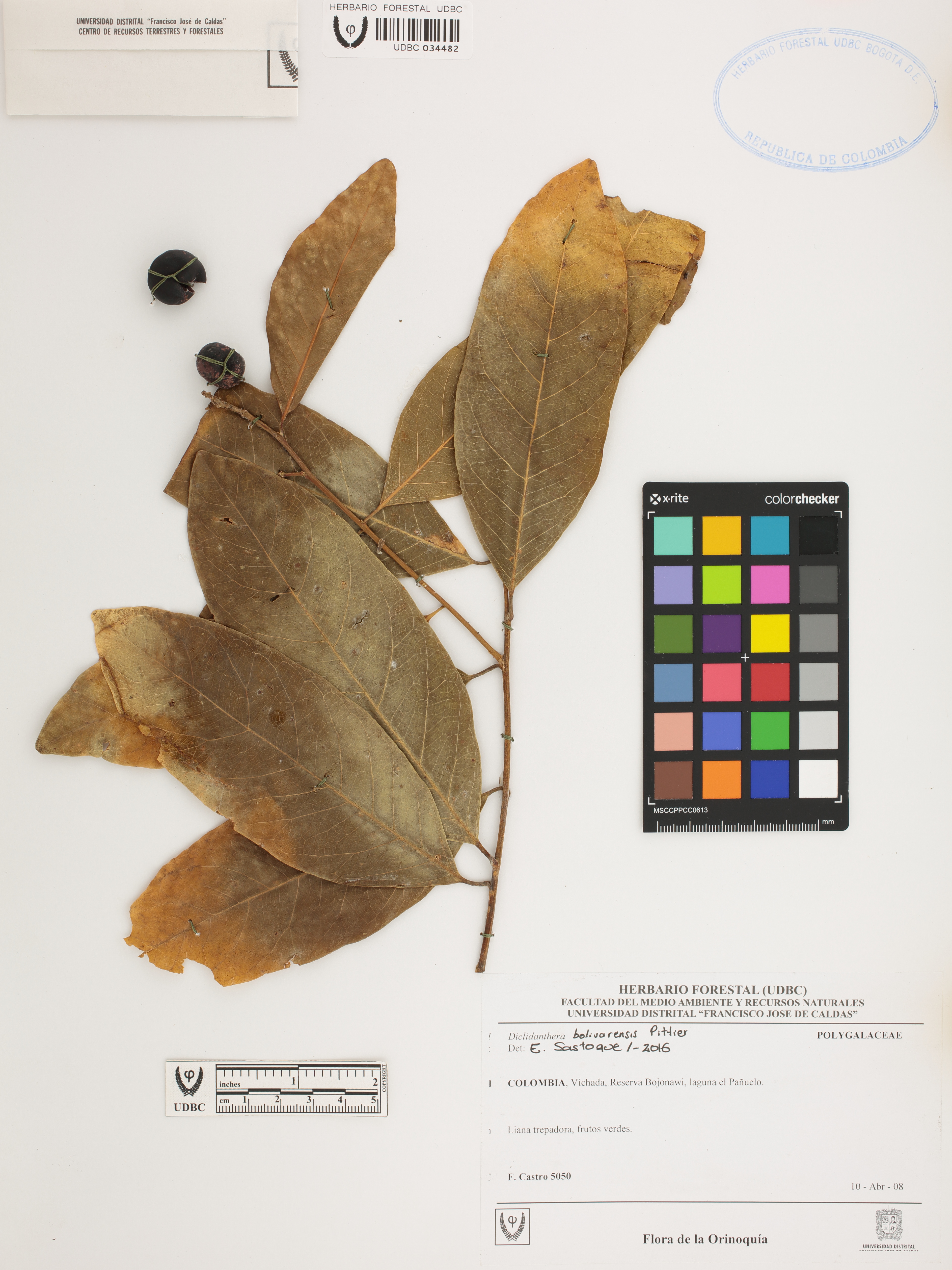 Fotografía del ejemplar Castro, F. 5050, determinado como Diclidanthera bolivarensis en el año 2016