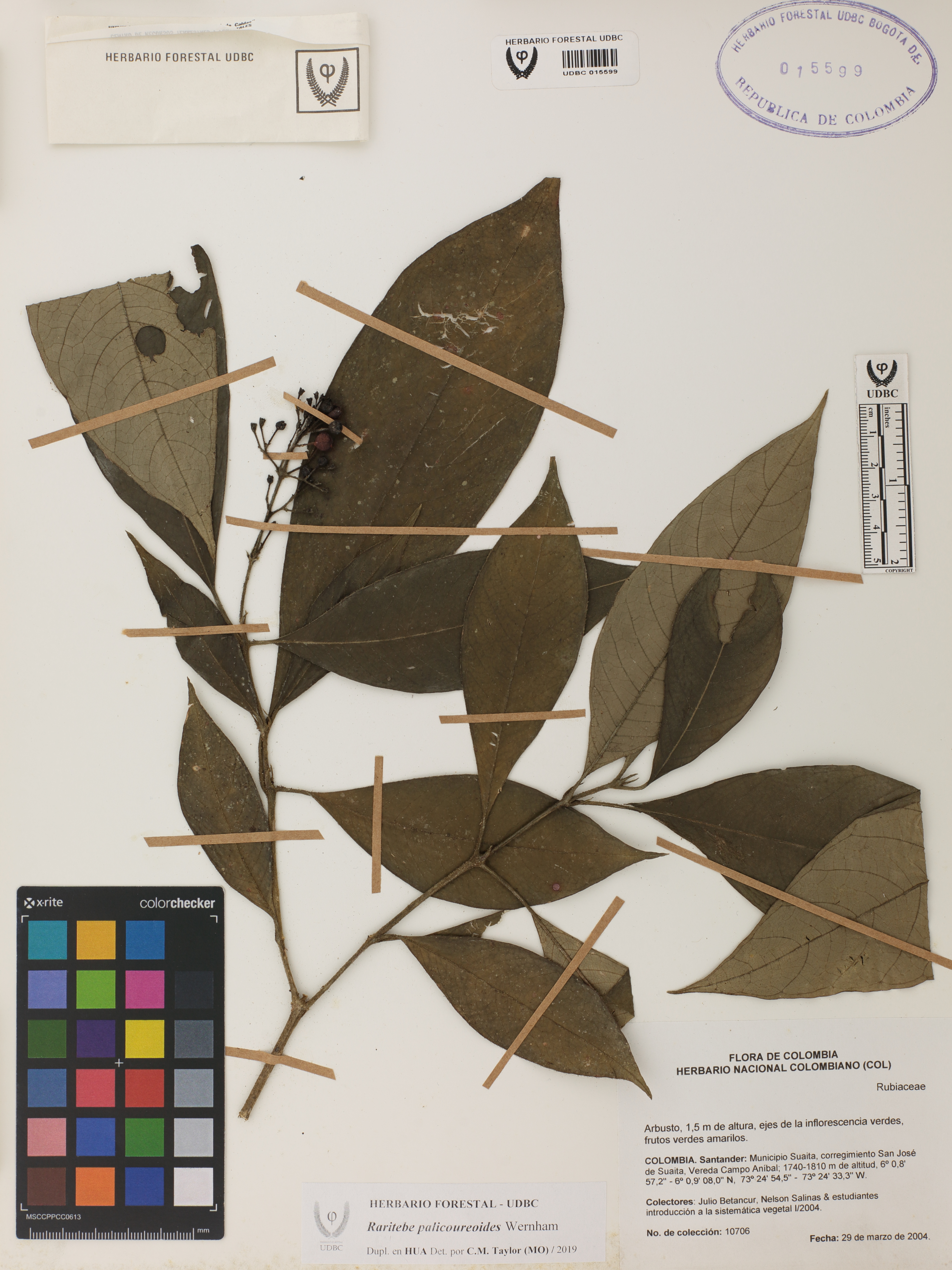 Fotografía del ejemplar Betancur, J. 10706, determinado como Raritebe palicoureoides en el año 2019