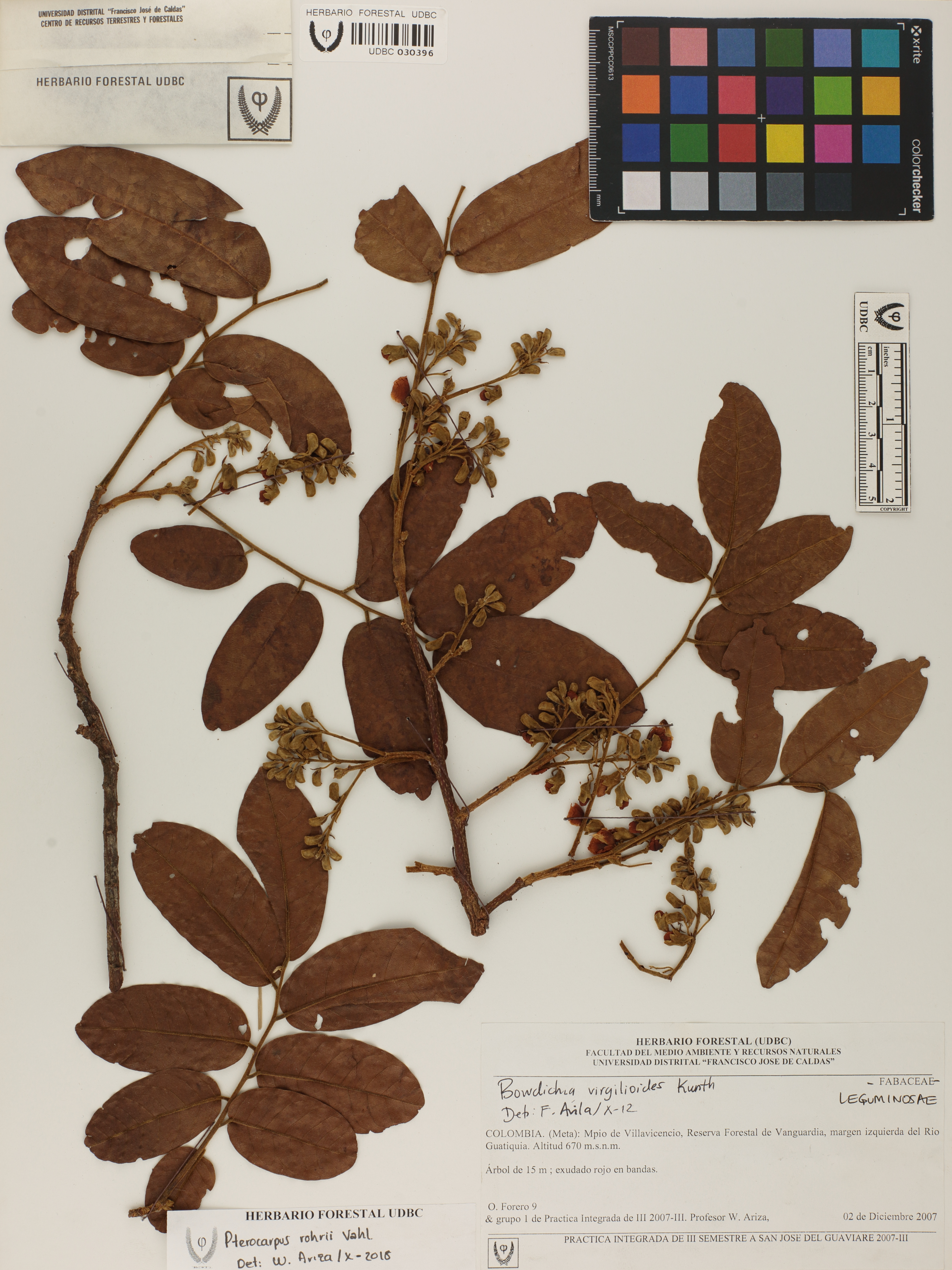 Fotografía del ejemplar Forero, O. 9, determinado como Pterocarpus rohrii en el año 2018