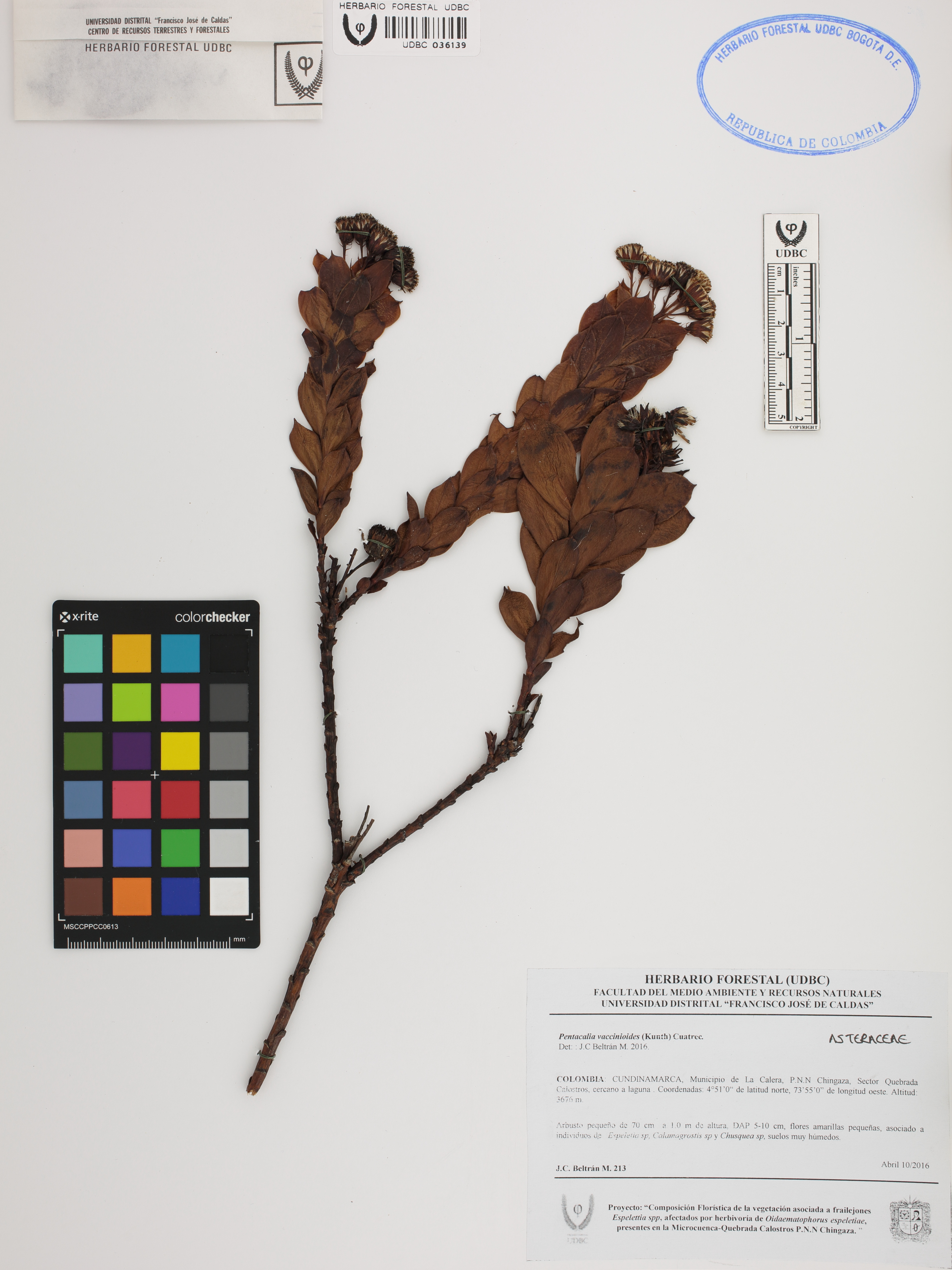 Fotografía del ejemplar Beltrán, J. 213, determinado como Pentacalia vaccinioides en el año 2016