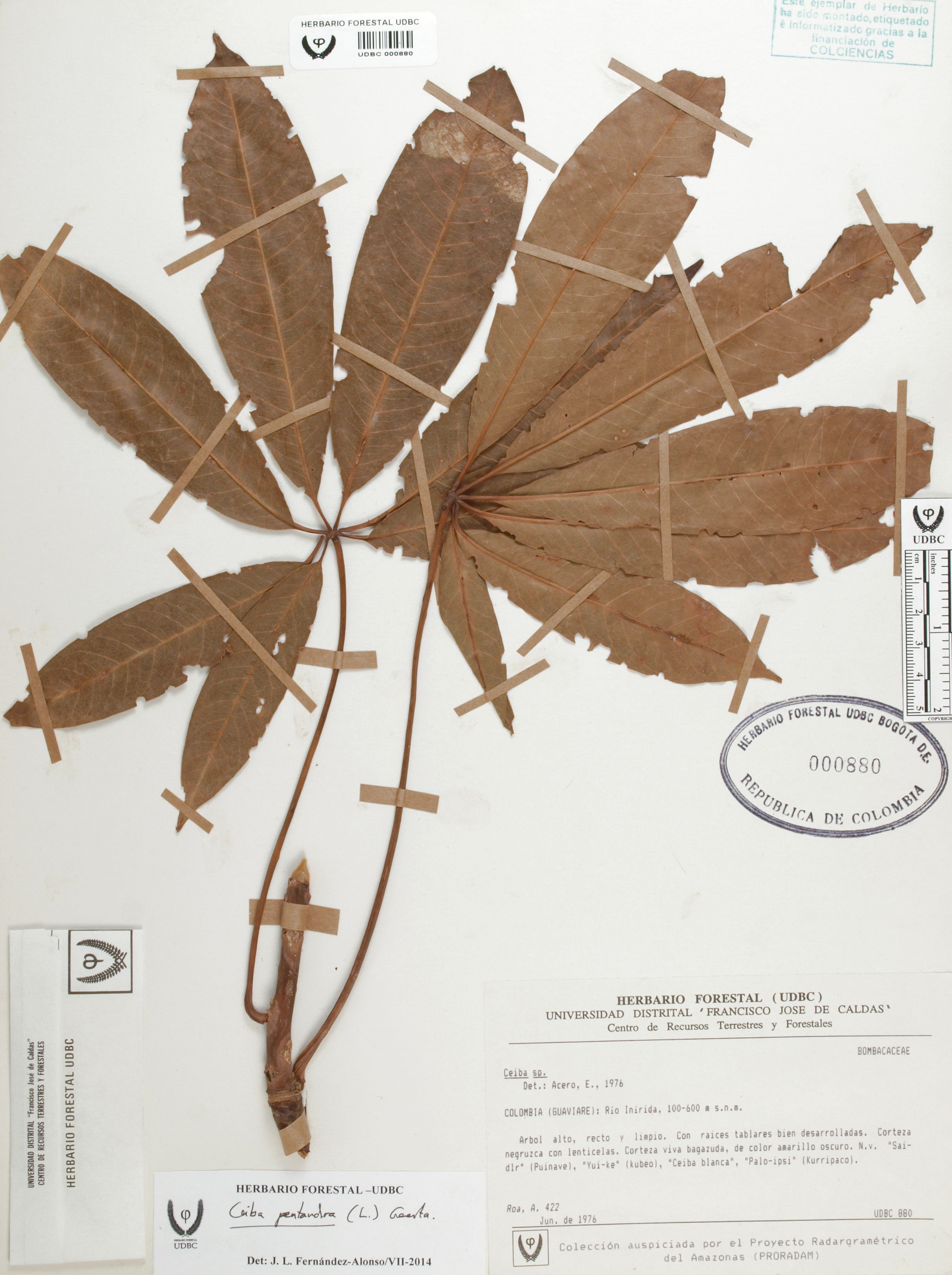 Fotografía del ejemplar Roa, A. 422, determinado como Ceiba pentandra en el año 2014
