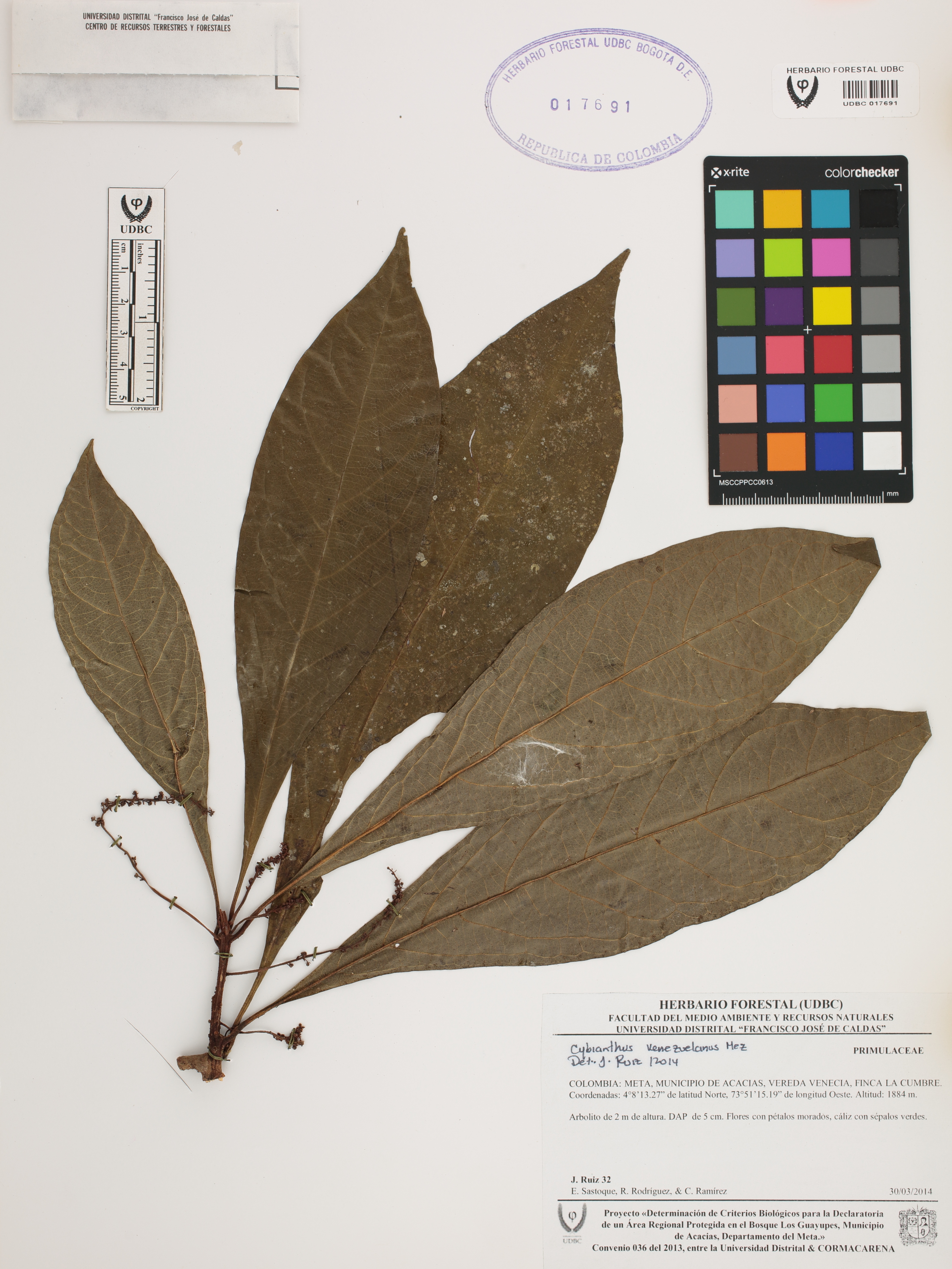Fotografía del ejemplar Ruiz, J. 32, determinado como Cybianthus venezuelanus en el año 2014