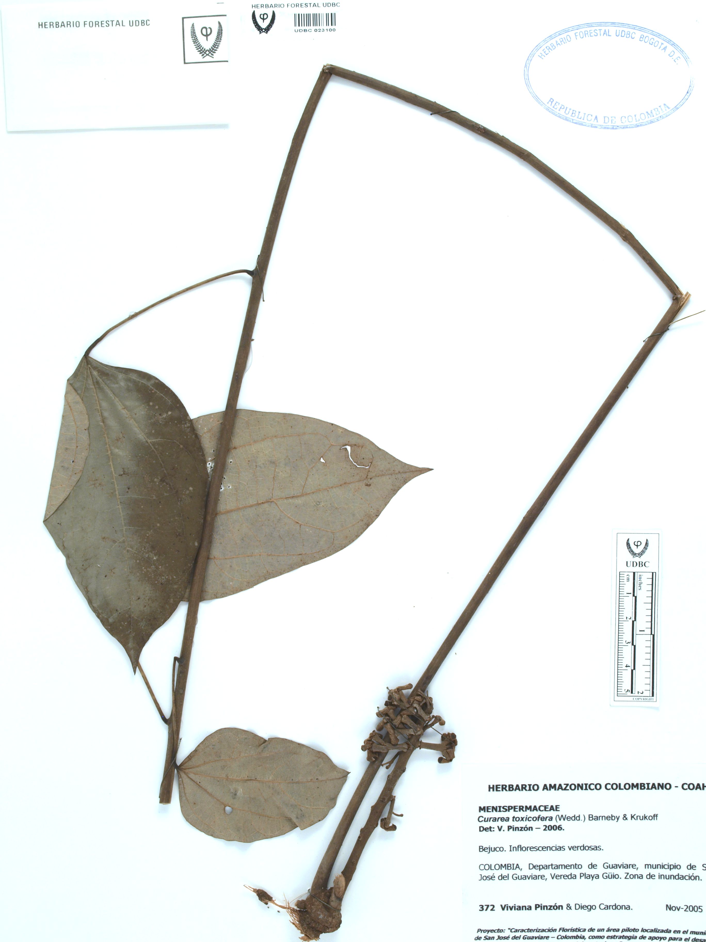 Fotografía del ejemplar Pinzón, V. 372, determinado como Curarea toxicofera en el año 2006