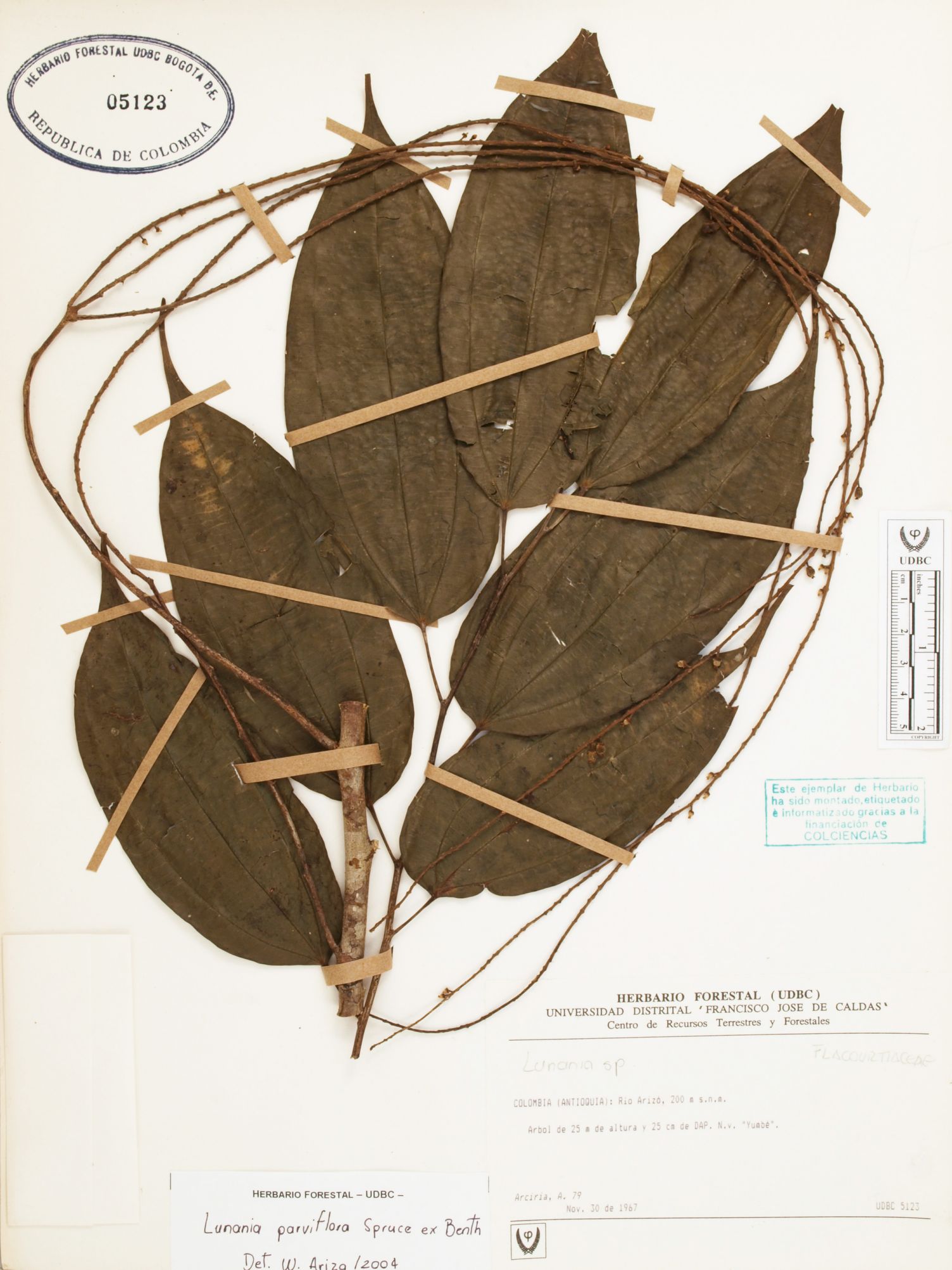 Fotografía del ejemplar Arciria, A. 79, determinado como Lunania parviflora en el año 2004